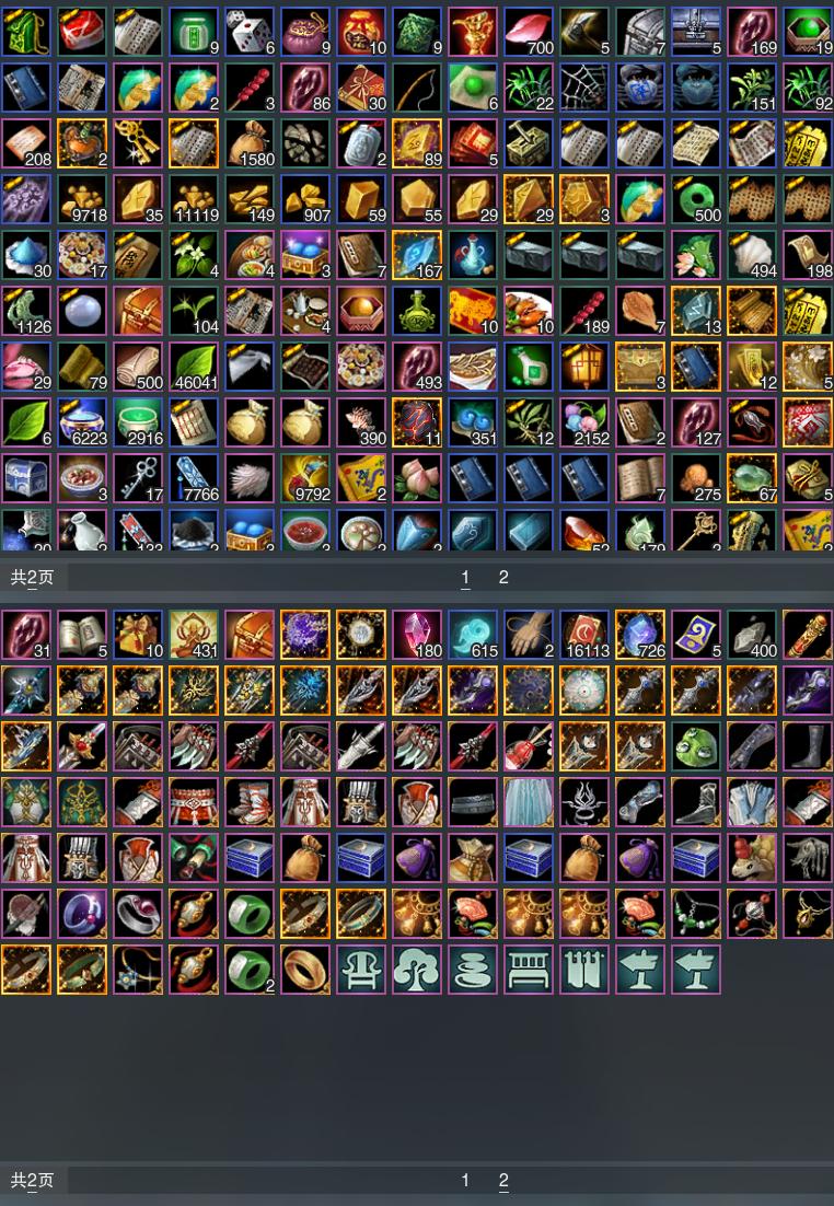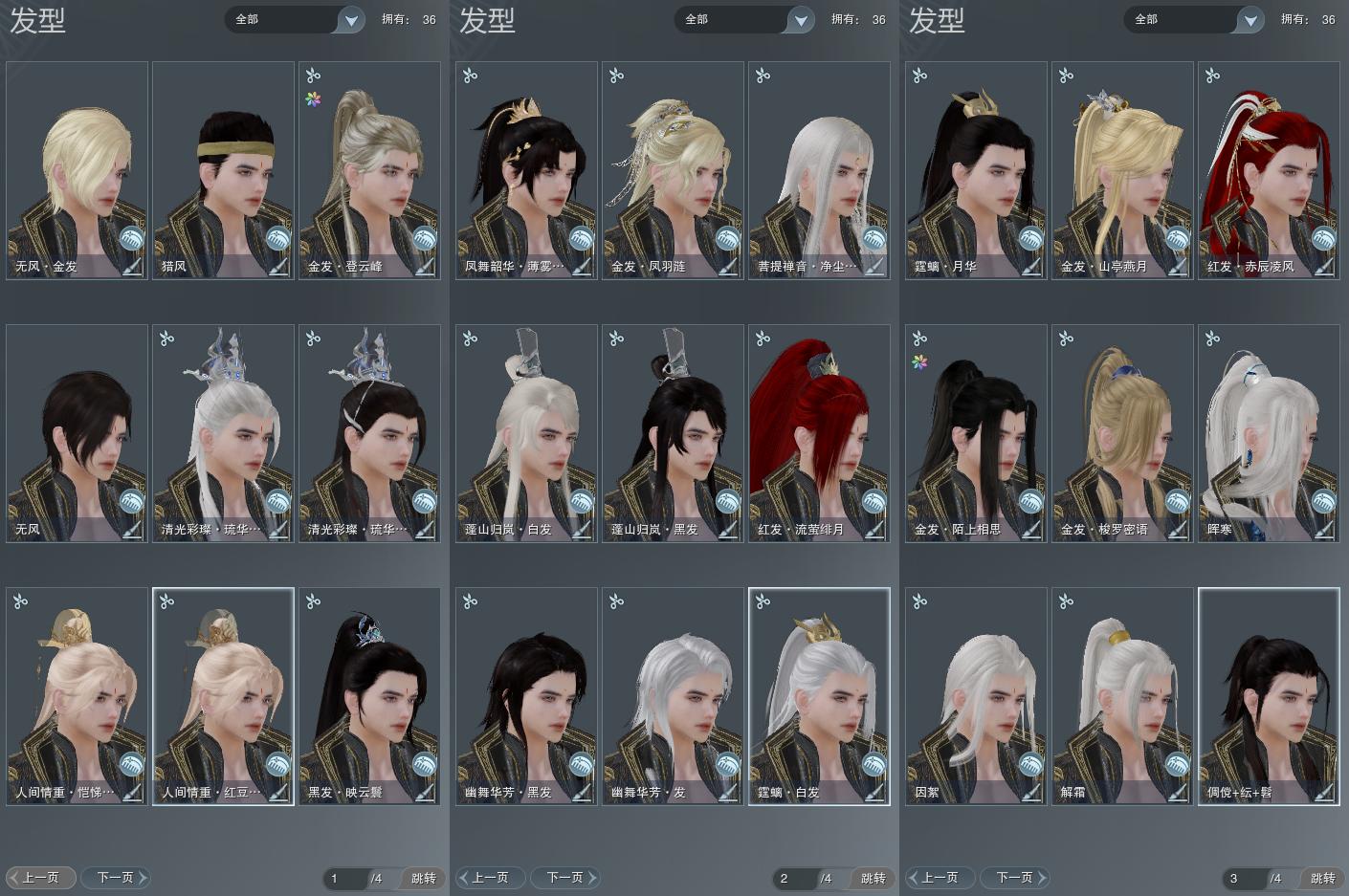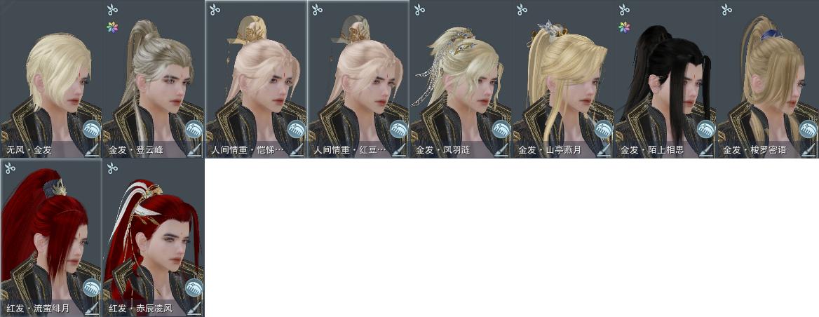 【发型】金发8个[资历金, 考金, 国金, 凤金, 三代金, 无风金发, 红人间金发, 黑人间金发], 红发2个[八红, 小资历红], 黑发10个, 白发8个, 盒子发型[二代花朝黑, 二代花朝白, 净尘黑发, 薄雾黑发, 净尘白发, 蓝钻石盒黑发, 蓝钻石盒白发], 总页数4