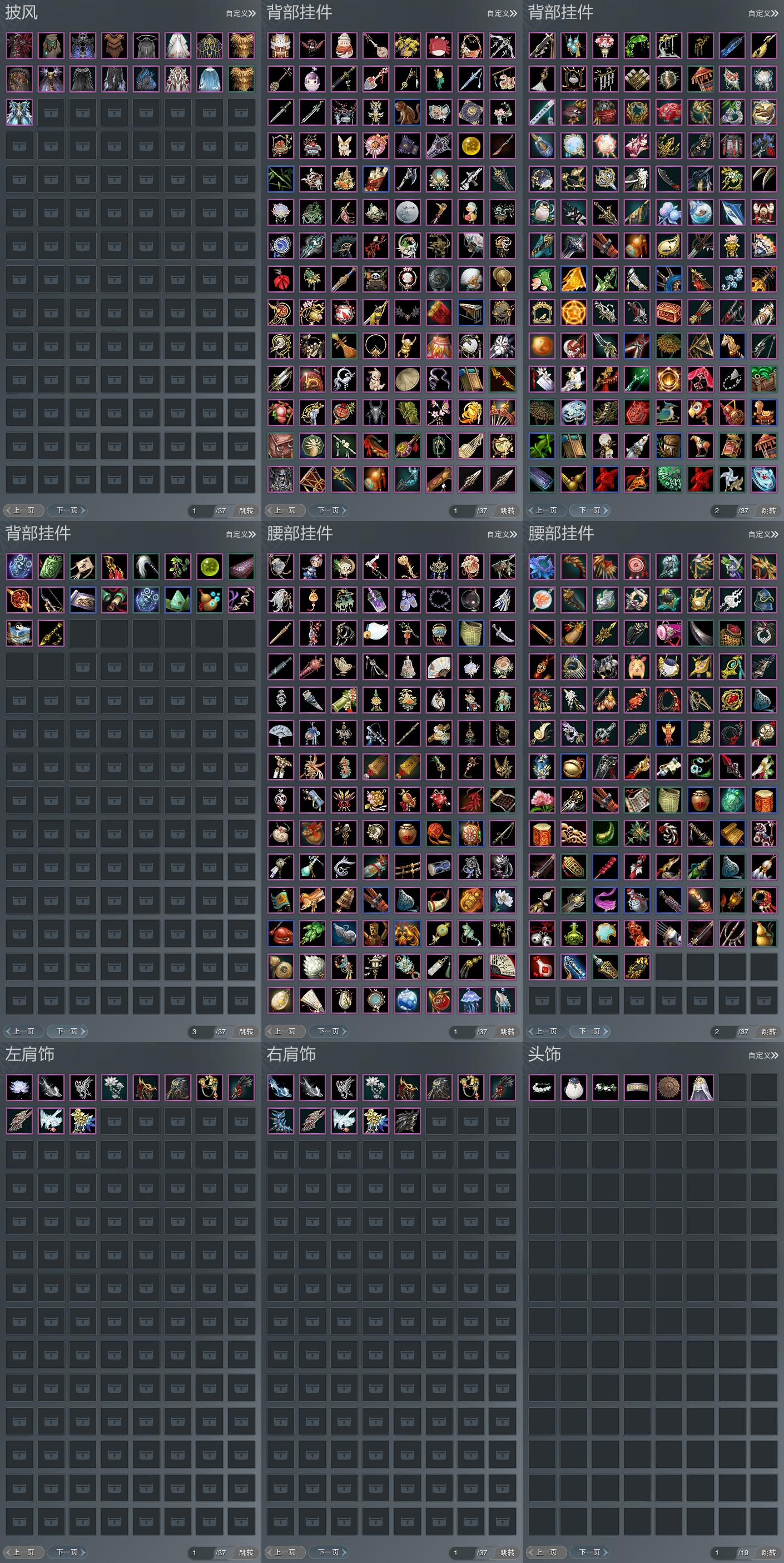 【肩饰】11左,13右,[绝代仙·千幻·左, 双鱼曳波·无量·左, 栖鹤云归·左, 浮屠明音·左, 迷金繁影·左, 短褐狂裘·左, 北望天狼·左, 鹤影天青·左][栖鹤云归·右, 浮屠明音·右, 迷金繁影·右, 短褐狂裘·右, 玄天覆雪·右, 北望天狼·右, 鹤影天青·右]