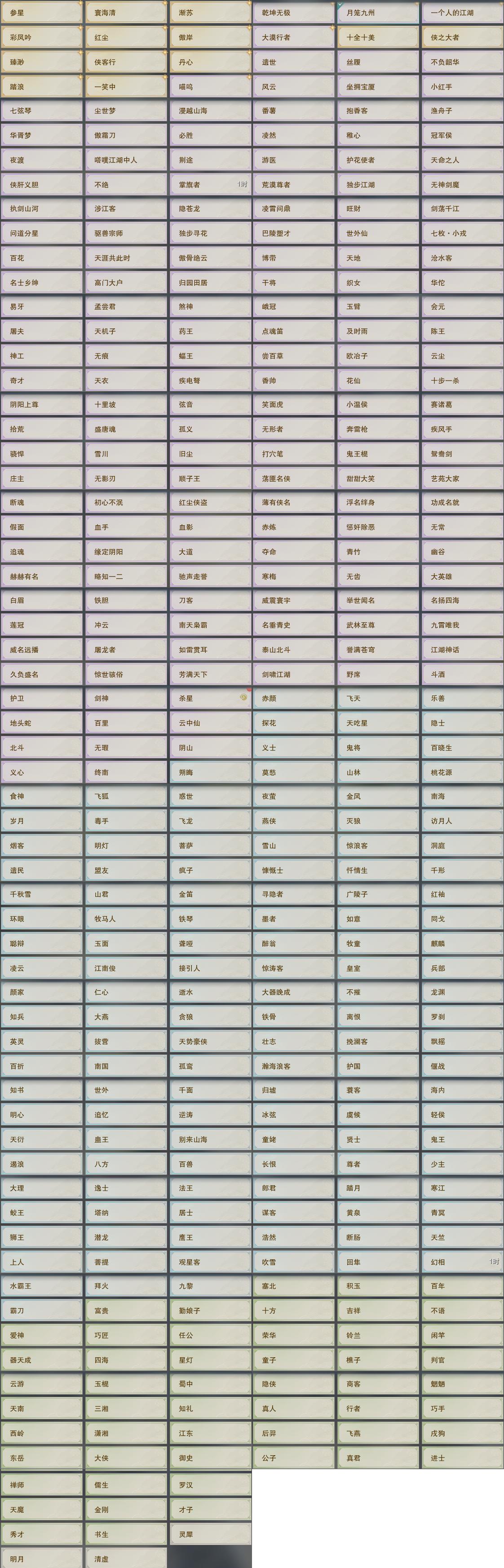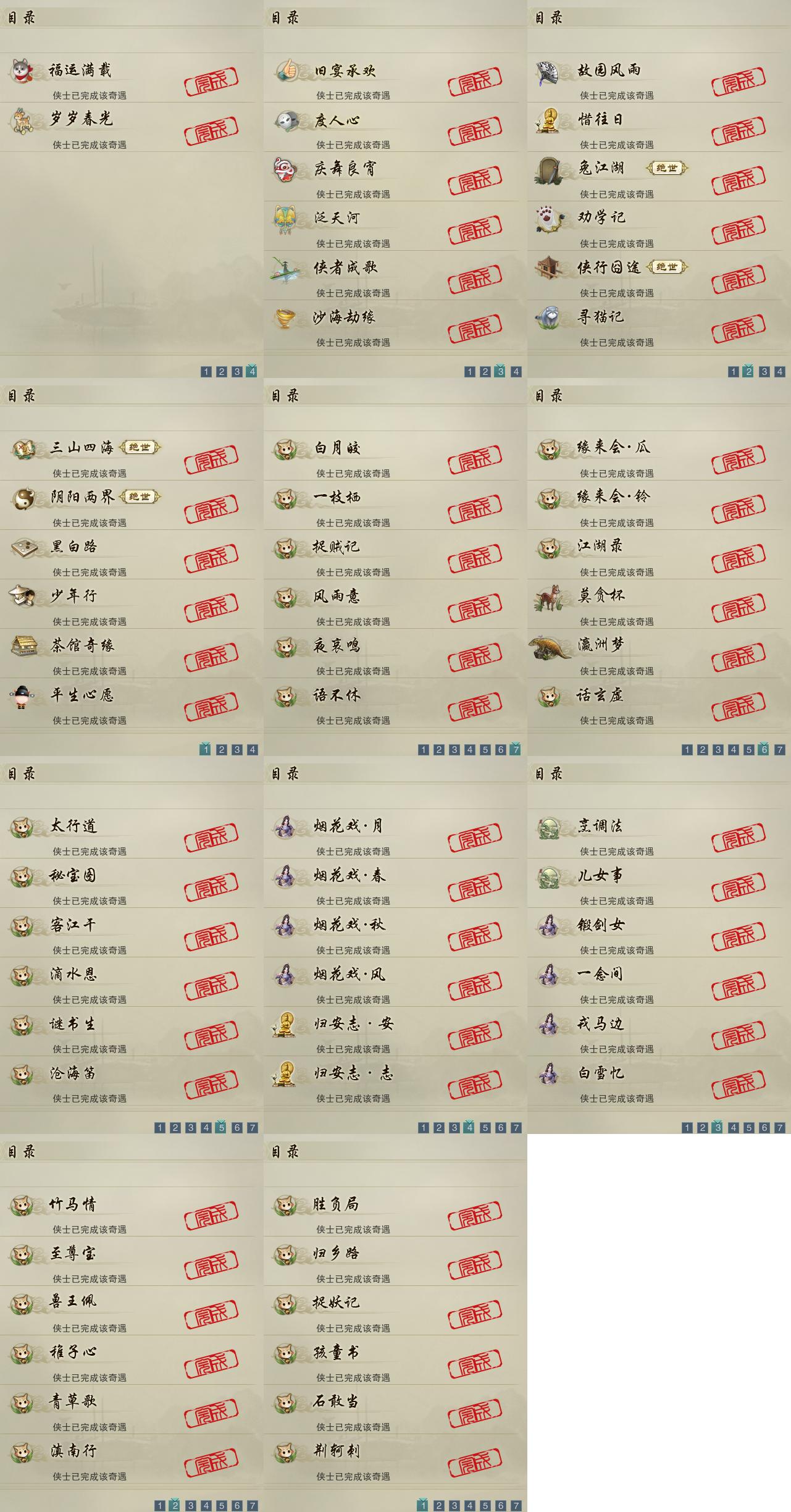 【奇遇】19个[三山四海, 劝学记, 阴阳两界, 兔江湖, 黑白路, 平生心愿, 惜往日, 少年行, 故园风雨, 侠行囧途, 寻猫记, 茶馆奇缘, 庆舞良宵, 度人心, 旧宴承欢, 泛天河, 侠者成歌, 沙海劫缘, 福运满载]