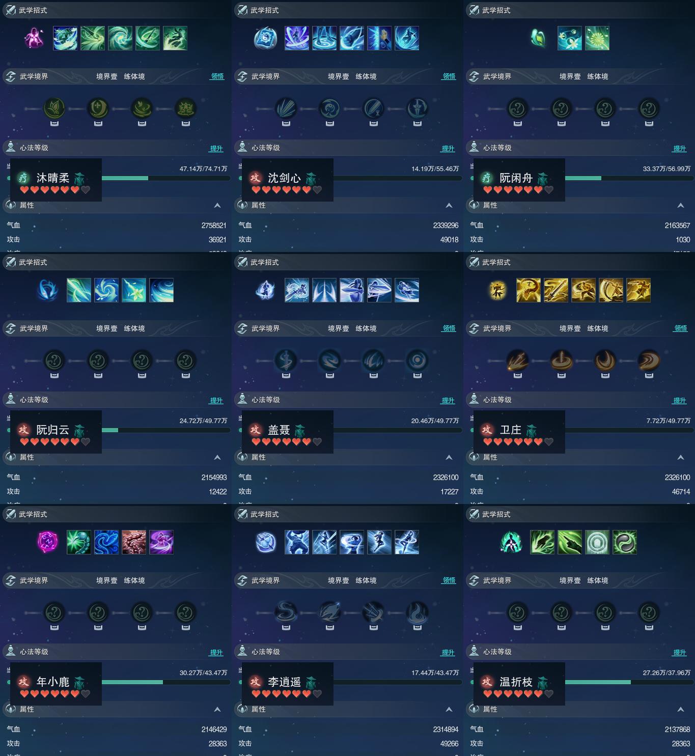 【同伴】沐晴柔82级境界壹,沈剑心81级境界壹,阮闲舟80级境界壹,阮归云79级境界壹,盖聂志79级境界壹,卫庄志79级境界壹,年小鹿78级境界壹,李逍遥78级境界壹,温折枝77级境界壹