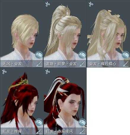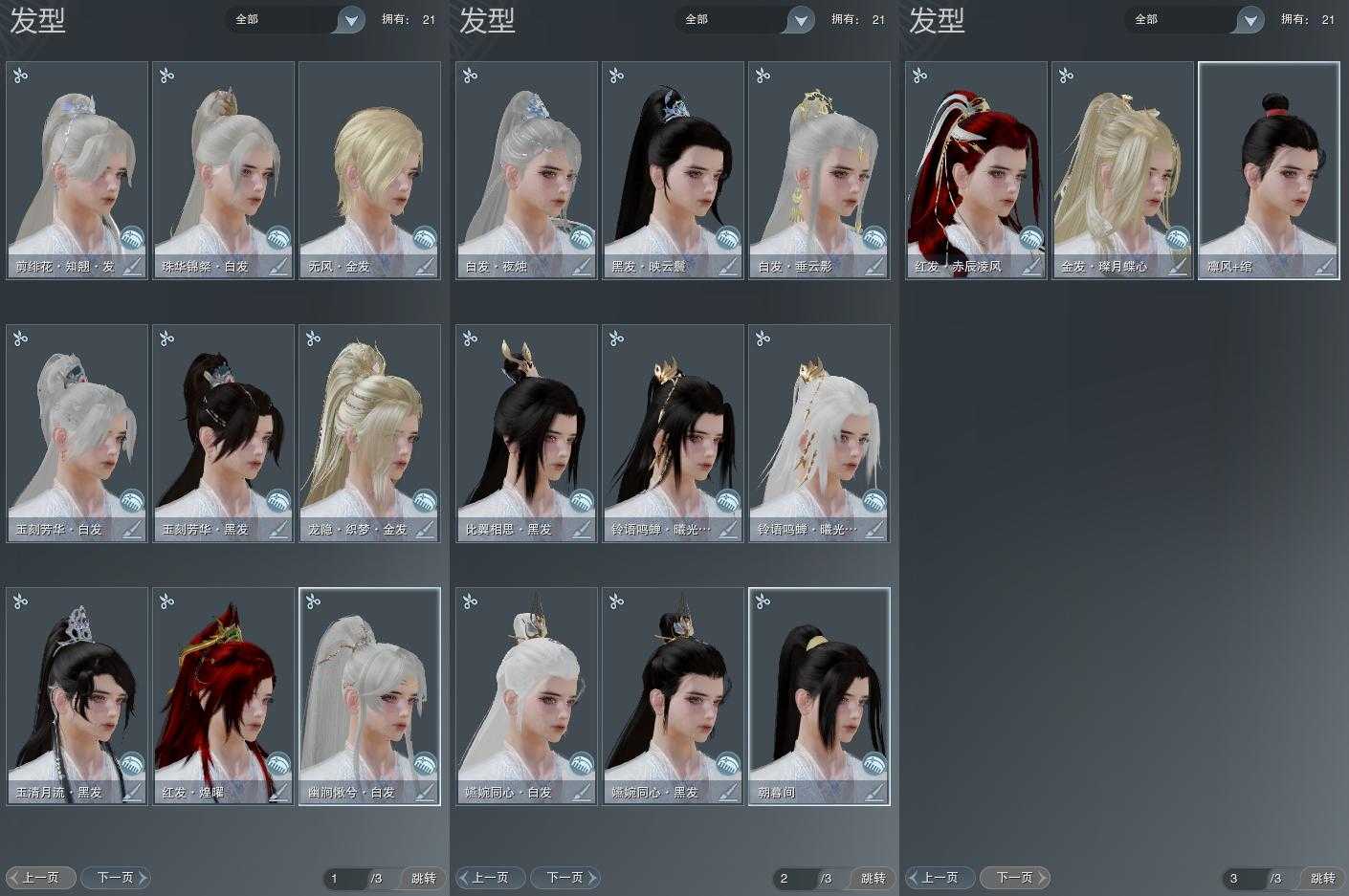【发型】金发3个[狐金, 无风金发, 白龙隐金发], 红发2个[八红, 兔红], 黑发7个, 白发9个, 盒子发型[四代七夕黑发, 白楼兰黑发, 四代七夕白发, 五代七夕黑发, 白楼兰白发, 幽涧愀兮白发, 八七盒黑发], 总页数3