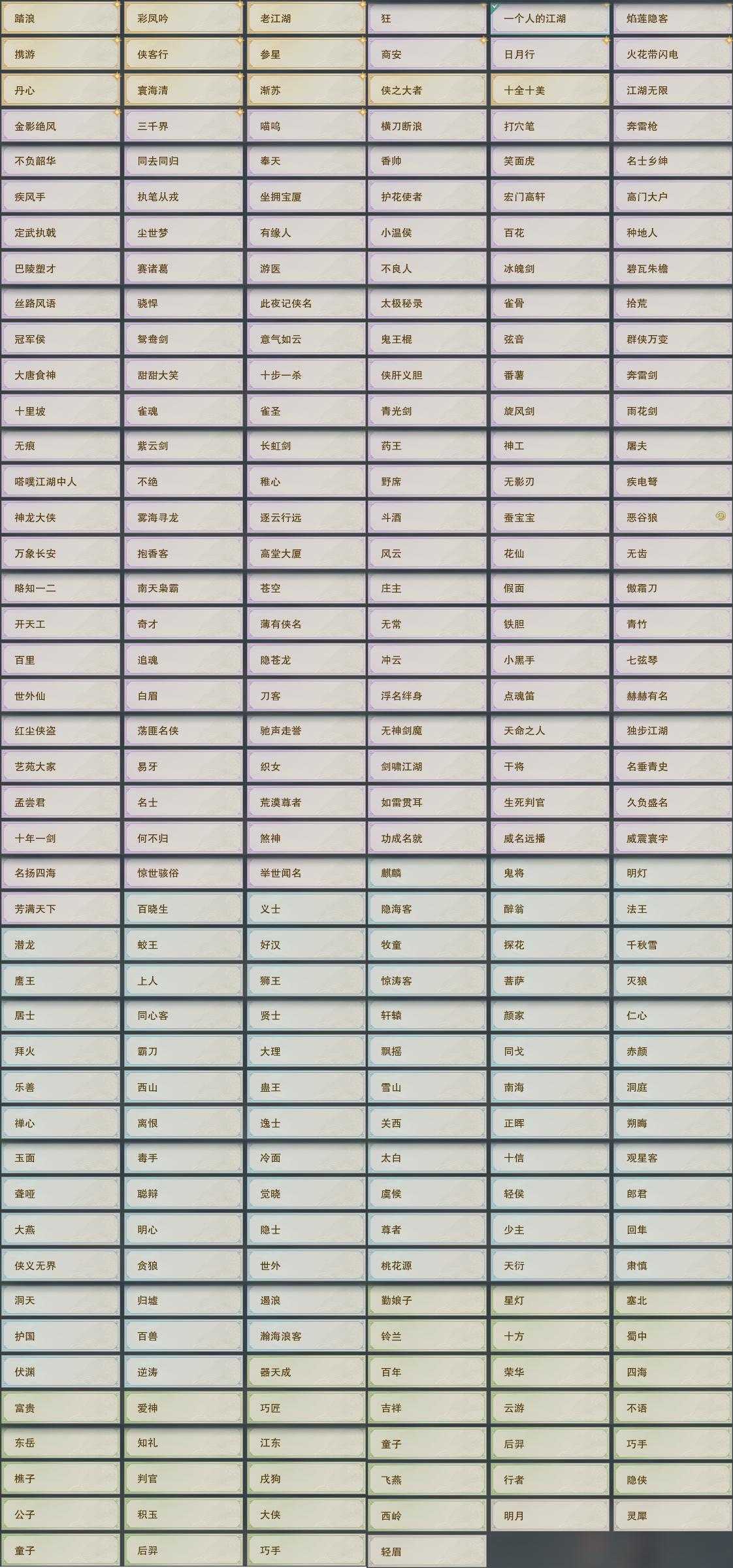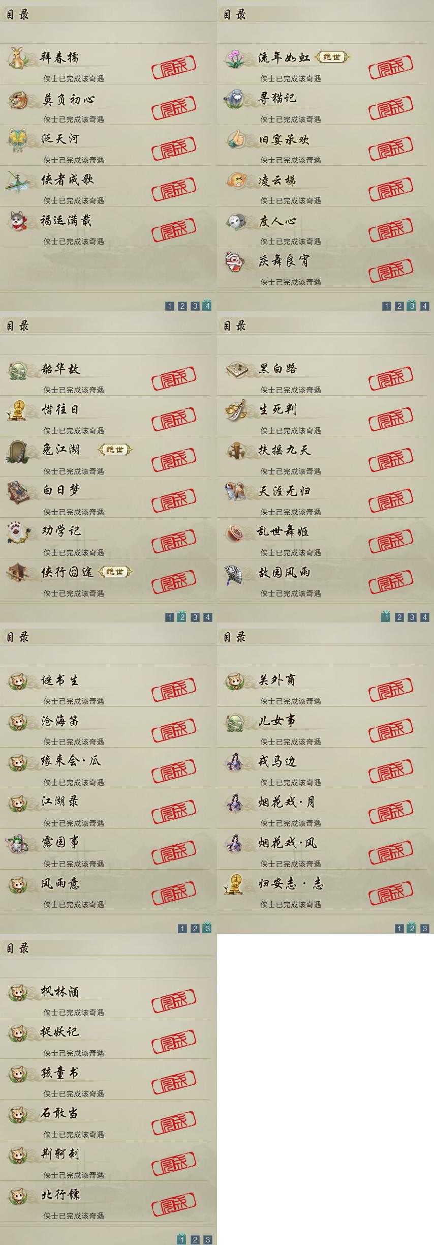 【奇遇】23个[白日梦, 天涯无归, 劝学记, 莫负初心, 兔江湖, 黑白路, 惜往日, 乱世舞姬, 韶华故, 扶摇九天, 故园风雨, 流年如虹, 寻猫记, 侠行囧途, 庆舞良宵, 生死判, 凌云梯, 度人心, 旧宴承欢, 泛天河, 侠者成歌, 拜春擂, 福运满载]