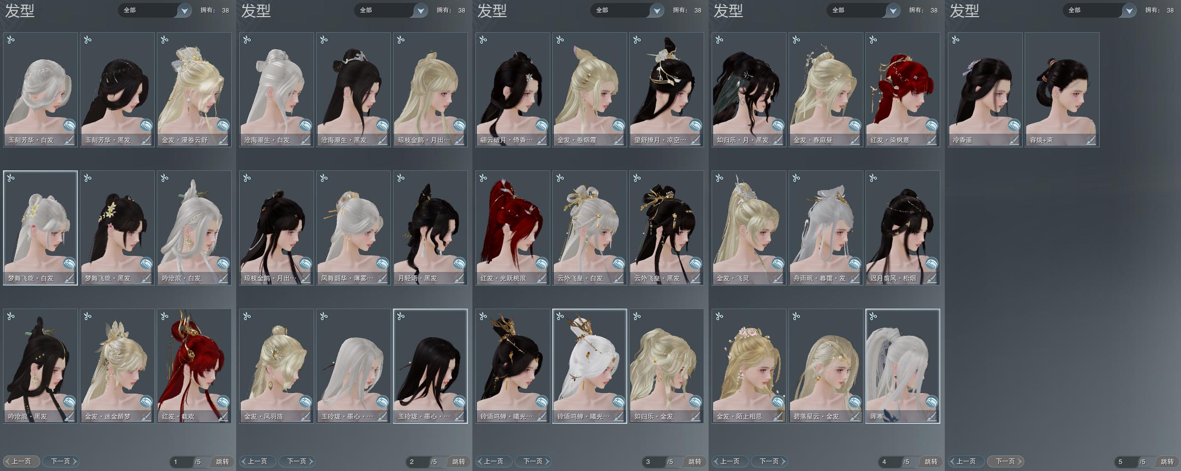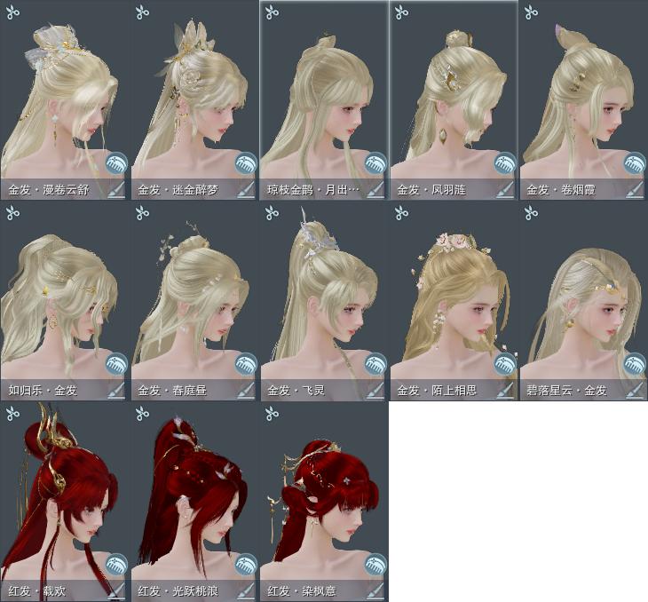 【发型】金发10个[鼠金, 考金, 苏金, 飒金, 如归金, 角金, 凤金, 牛金, 云金, 澄琼枝金发], 红发3个[十一红, 鼠红, 牛红], 黑发14个, 白发10个, 盒子发型[一代花朝白白, 白楼兰黑发, 绿如归黑发, 飞皇黑发, 绿中秋黑发, 粉同人黑发, 白楼兰白发, 墨心黑发, 飞皇白发, 月轻语黑发, 澄琼枝黑发, 墨心白发, 沧海黑发, 薄雾白发, 沧海白发, 竹笛黑发, 小熊黑发, 竹笛白发, 小熊白发], 总页数5