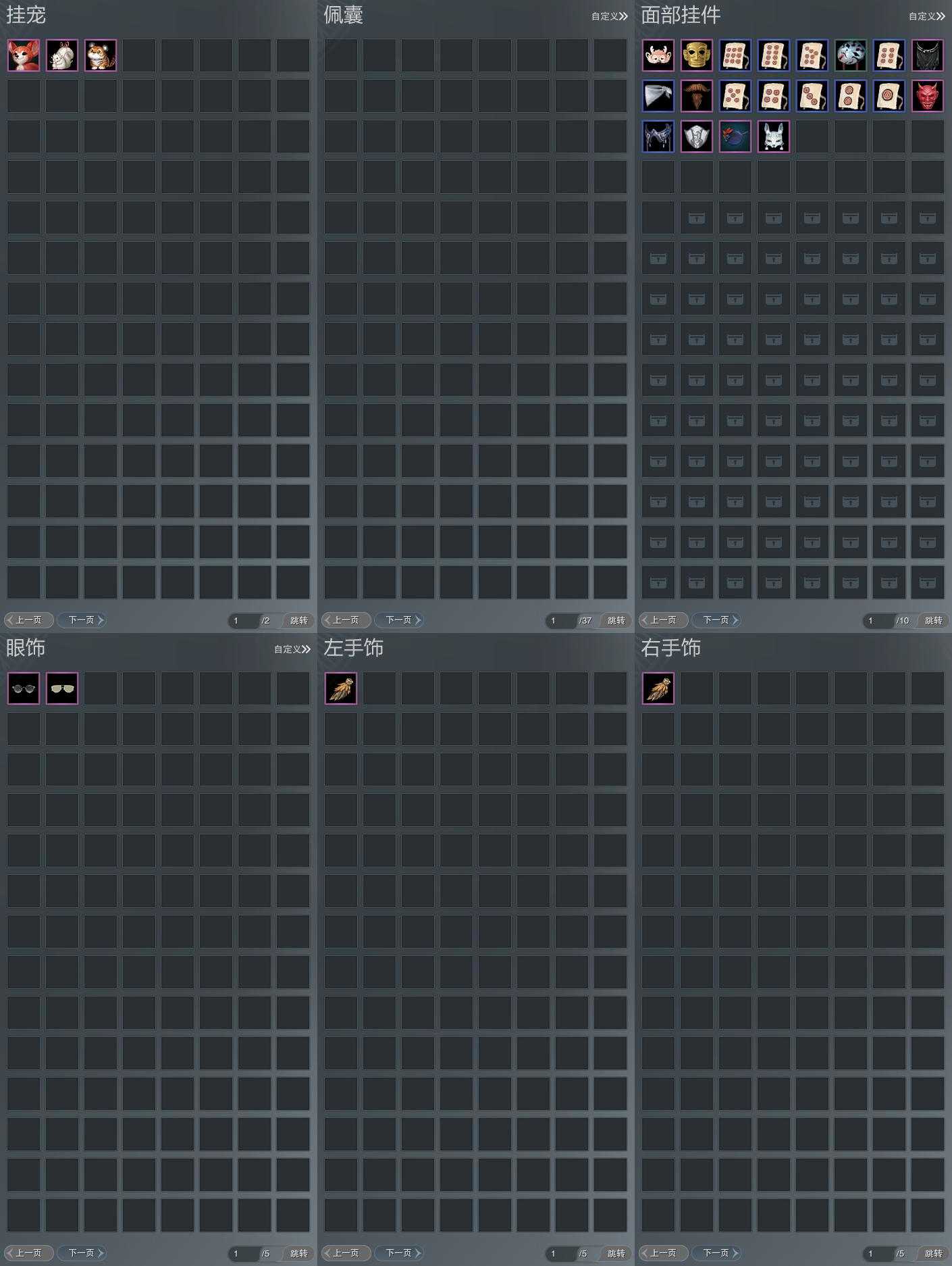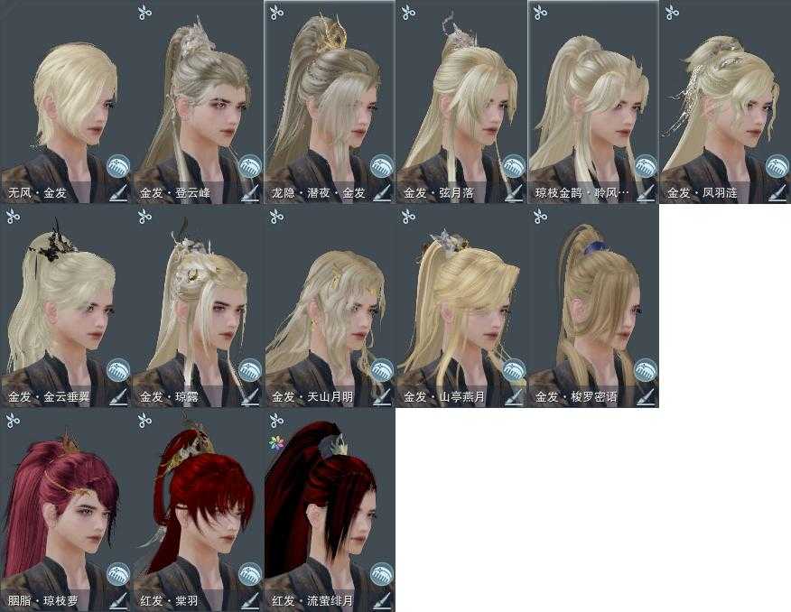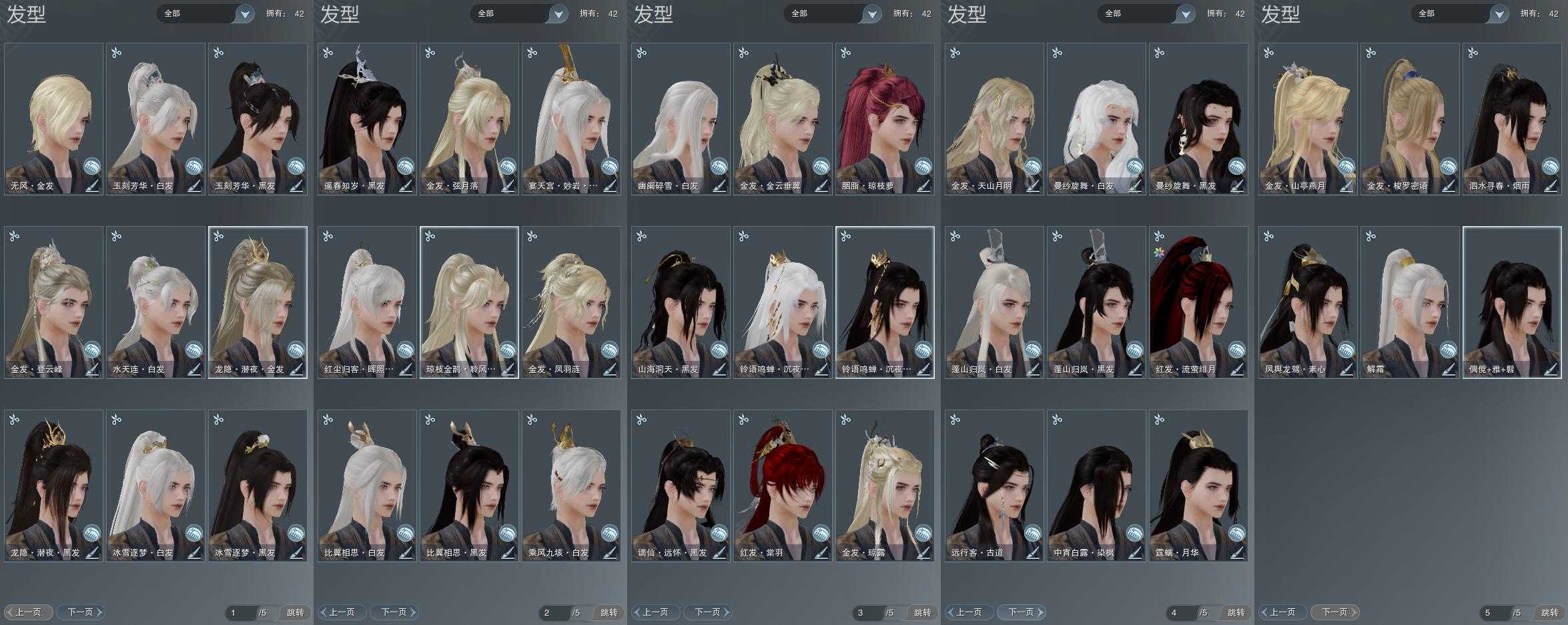 【发型】金发11个[资历金, 国金, 丝路金, 珊瑚金, 苍金, 凤金, 巴卡金, 三代金, 无风金发, 白琼枝金发, 黑龙隐金发], 红发3个[十红, 紫发, 小资历红], 黑发15个, 白发12个, 盒子发型[二代花朝黑, 丝路黑, 黑谪仙黑发, 黑楼兰黑发, 二代花朝白, 丝路白, 五代七夕黑发, 黑楼兰白发, 幽阑白发, 二代乘风白发, 五代七夕白发, 黑红尘白发, 黑狮白发, 红梅盒黑发, 花滑黑发, 花滑白发, 黑龙隐黑发], 总页数5