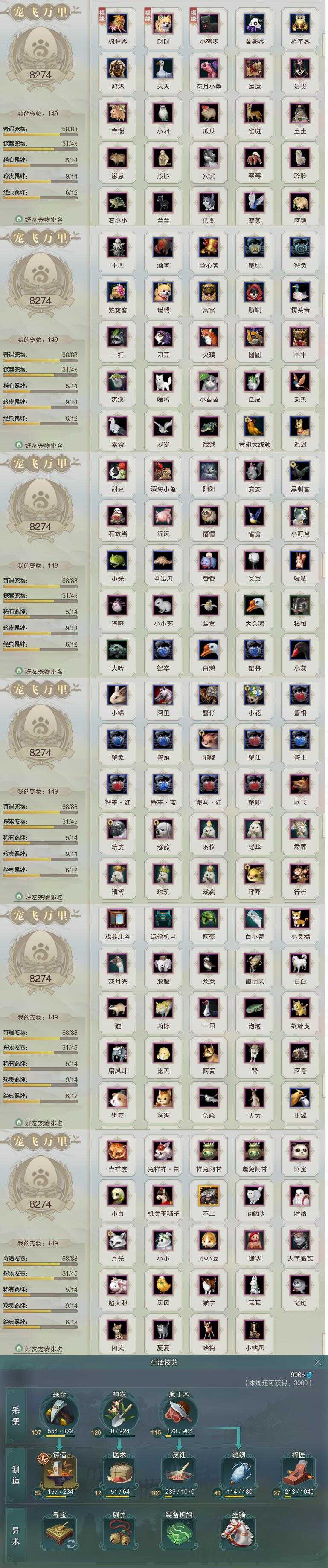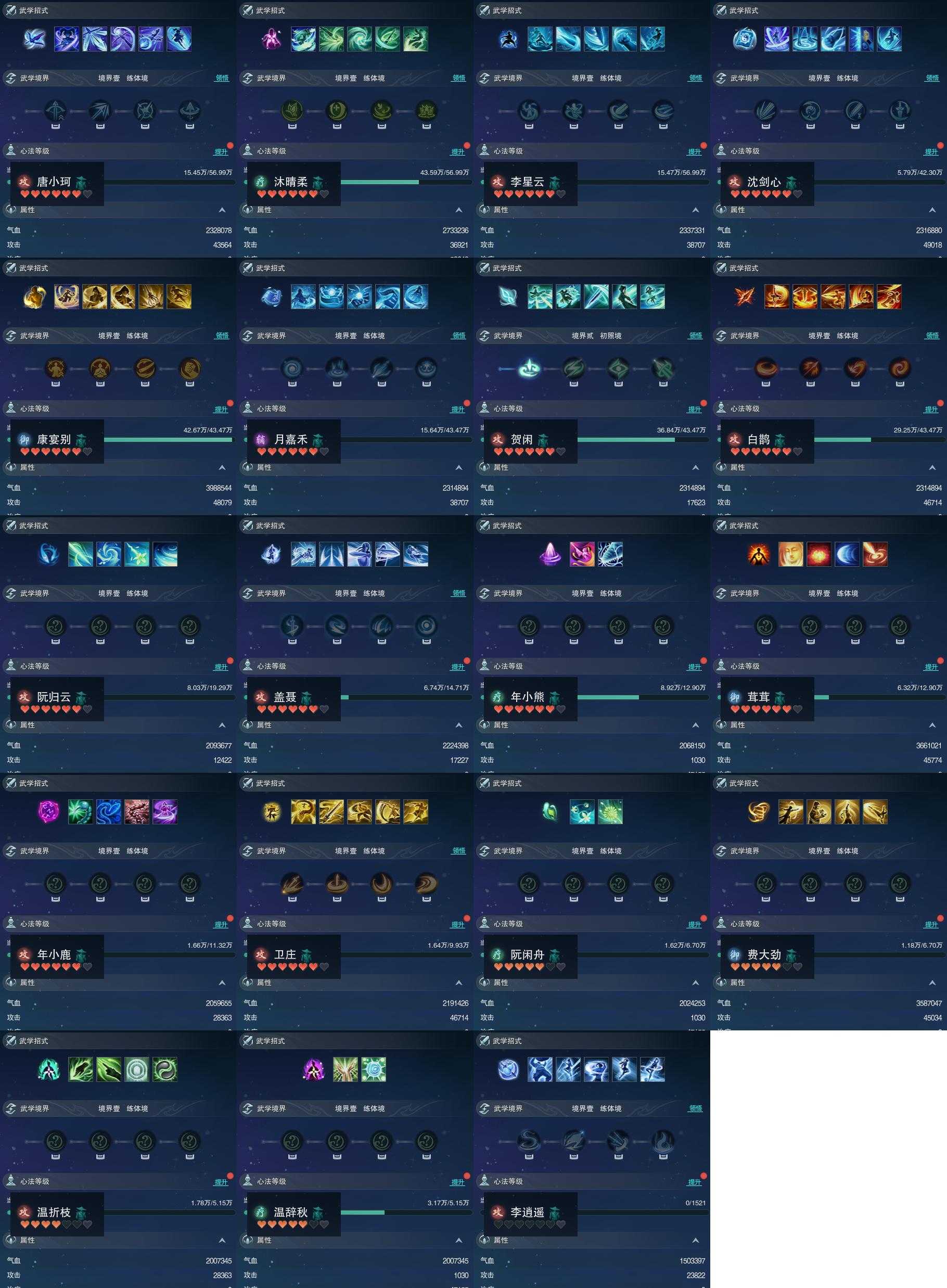 【同伴】唐小珂80级境界壹,沐晴柔80级境界壹,李星云80级境界壹,沈剑心79级境界壹,康宴别78级境界壹,月嘉禾78级境界壹,贺闲志78级境界贰,白鹊志78级境界壹,阮归云72级境界壹,盖聂志70级境界壹,年小熊69级境界壹,茸茸志69级境界壹,年小鹿68级境界壹,卫庄志67级境界壹,阮闲舟64级境界壹,费大劲64级境界壹,温折枝62级境界壹,温辞秋62级境界壹,李逍遥1级境界壹