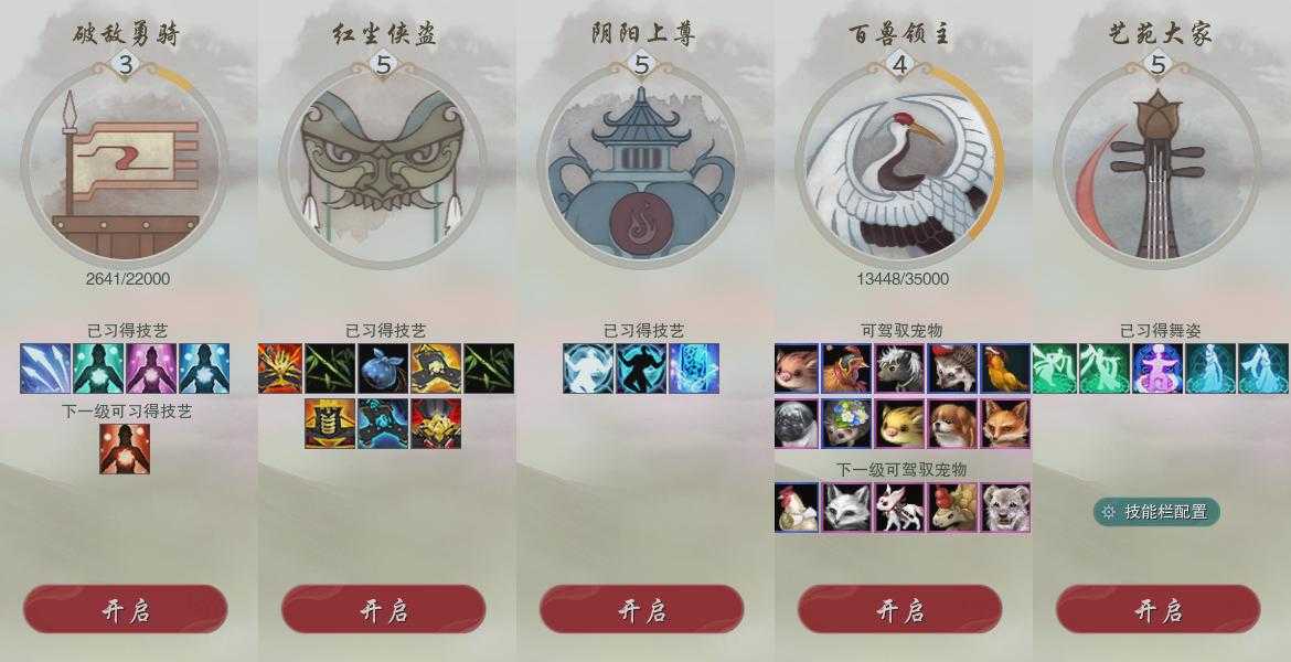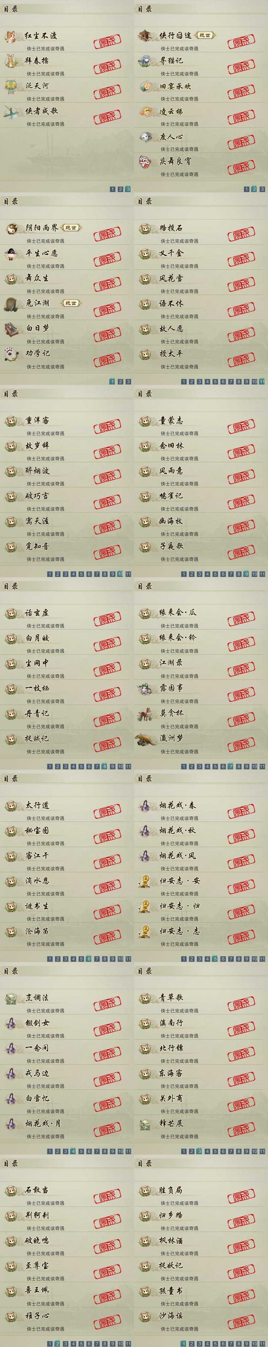 【奇遇】16个[白日梦, 阴阳两界, 劝学记, 平生心愿, 兔江湖, 舞众生, 侠行囧途, 寻猫记, 庆舞良宵, 凌云梯, 度人心, 旧宴承欢, 泛天河, 红尘不渡, 侠者成歌, 拜春擂]