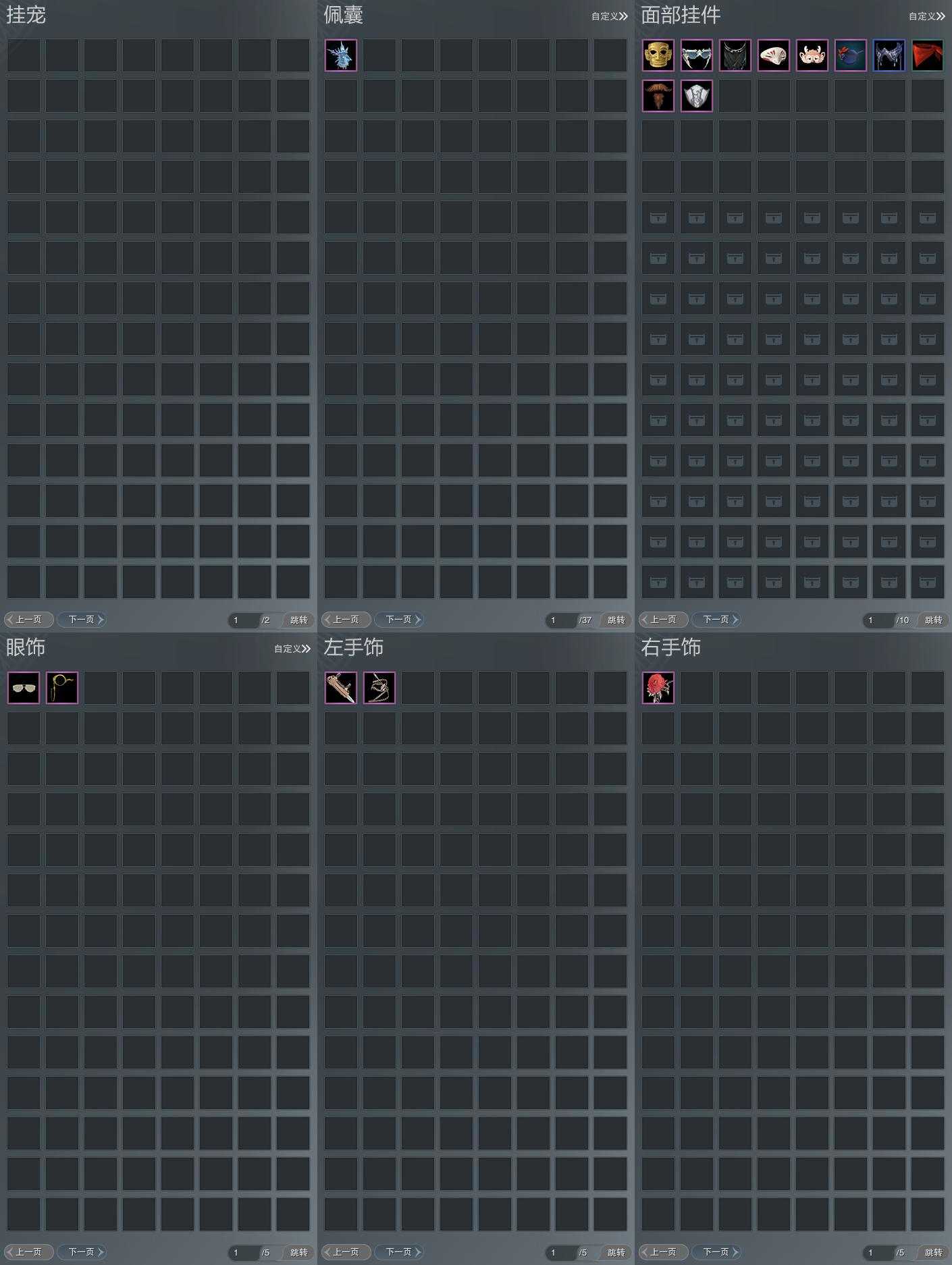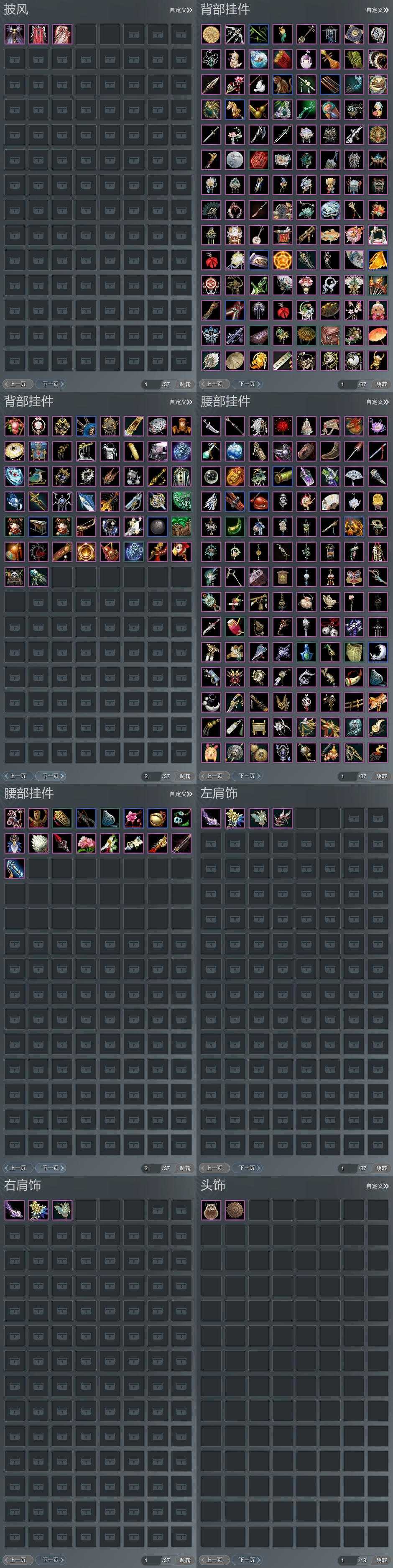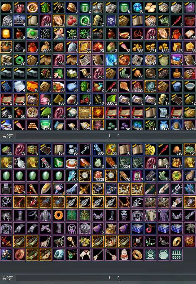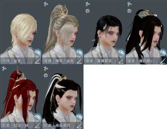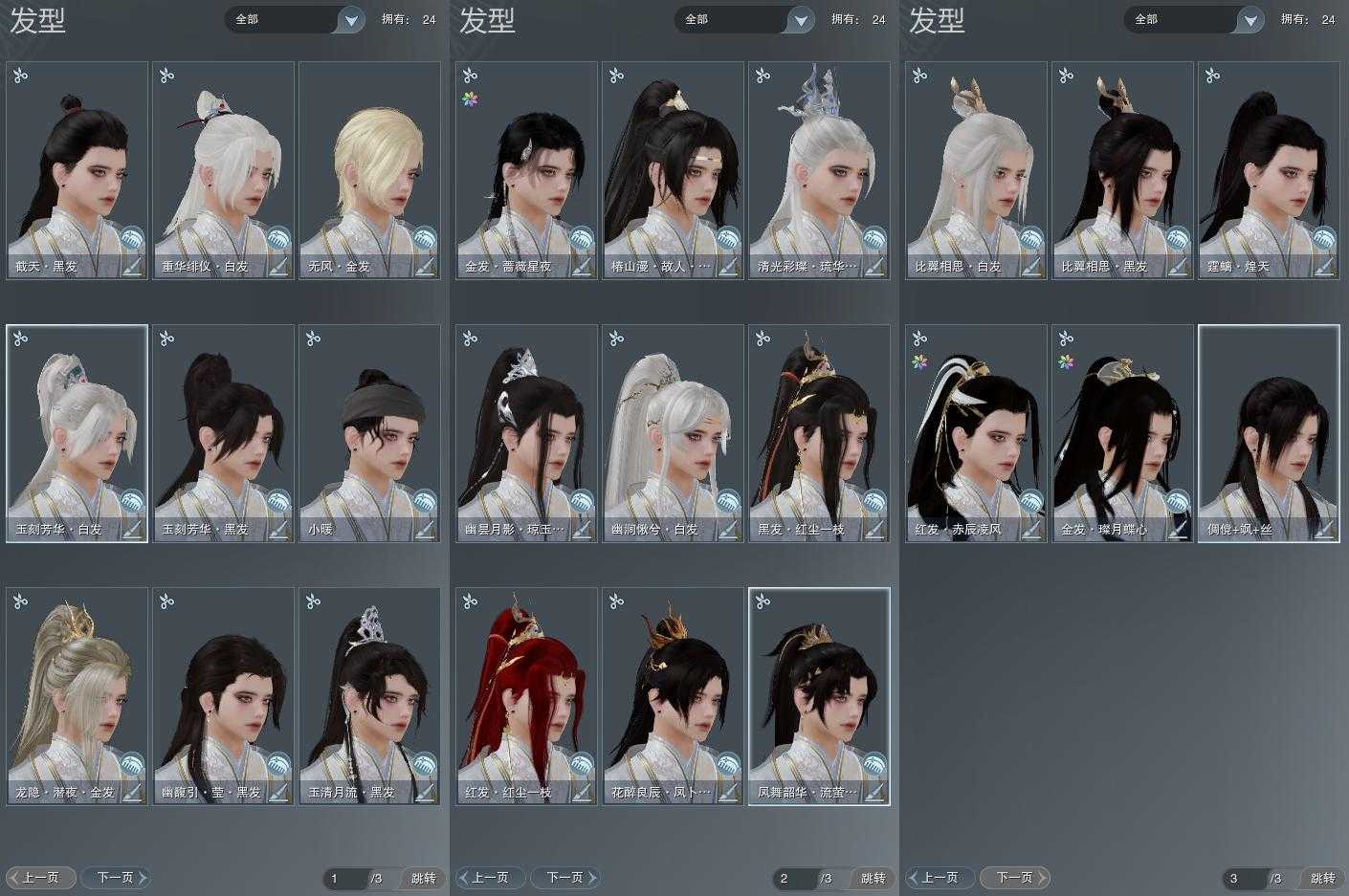 【发型】金发4个[狐金, 蔷薇金, 无风金发, 黑龙隐金发], 红发2个[八红, 十二红], 黑发12个, 白发5个, 盒子发型[五代七夕黑发, 五代七夕白发, 流萤黑发, 红六七黑发, 十二黑, 箜篌黑发, 白幽昙黑发, 幽涧愀兮白发, 黑椿山黑发, 蓝钻石盒白发, 八七盒黑发], 总页数3