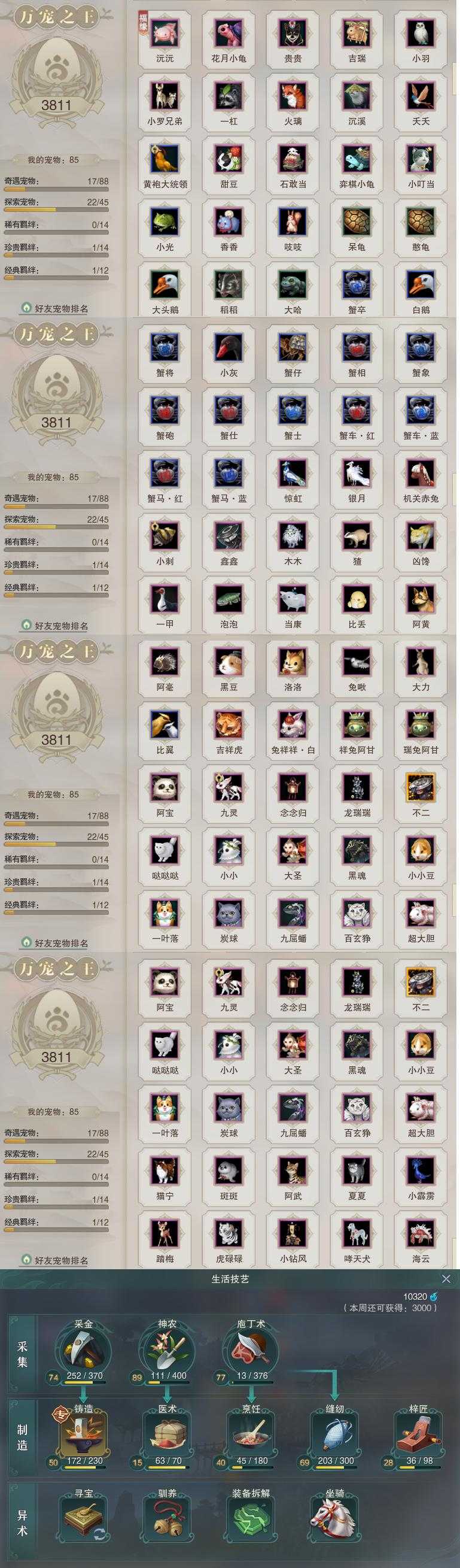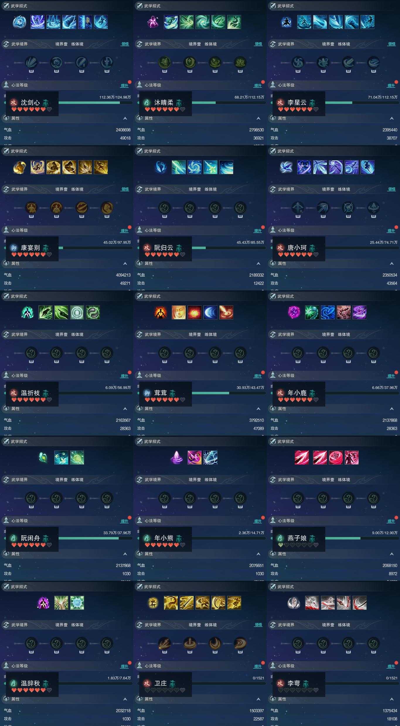 【同伴】沈剑心87级境界壹,沐晴柔85级境界壹,李星云85级境界壹,康宴别84级境界壹,阮归云83级境界壹,唐小珂82级境界壹,温折枝80级境界壹,茸茸志78级境界壹,年小鹿77级境界壹,阮闲舟77级境界壹,年小熊70级境界壹,燕子娘69级境界壹,温辞秋65级境界壹,卫庄志1级境界壹,李萼志1级境界壹