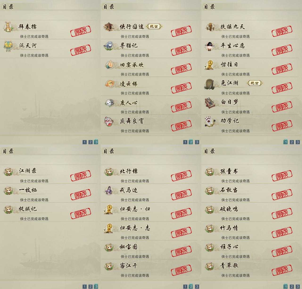 【奇遇】14个[白日梦, 劝学记, 平生心愿, 兔江湖, 惜往日, 扶摇九天, 侠行囧途, 寻猫记, 庆舞良宵, 凌云梯, 度人心, 旧宴承欢, 泛天河, 拜春擂]