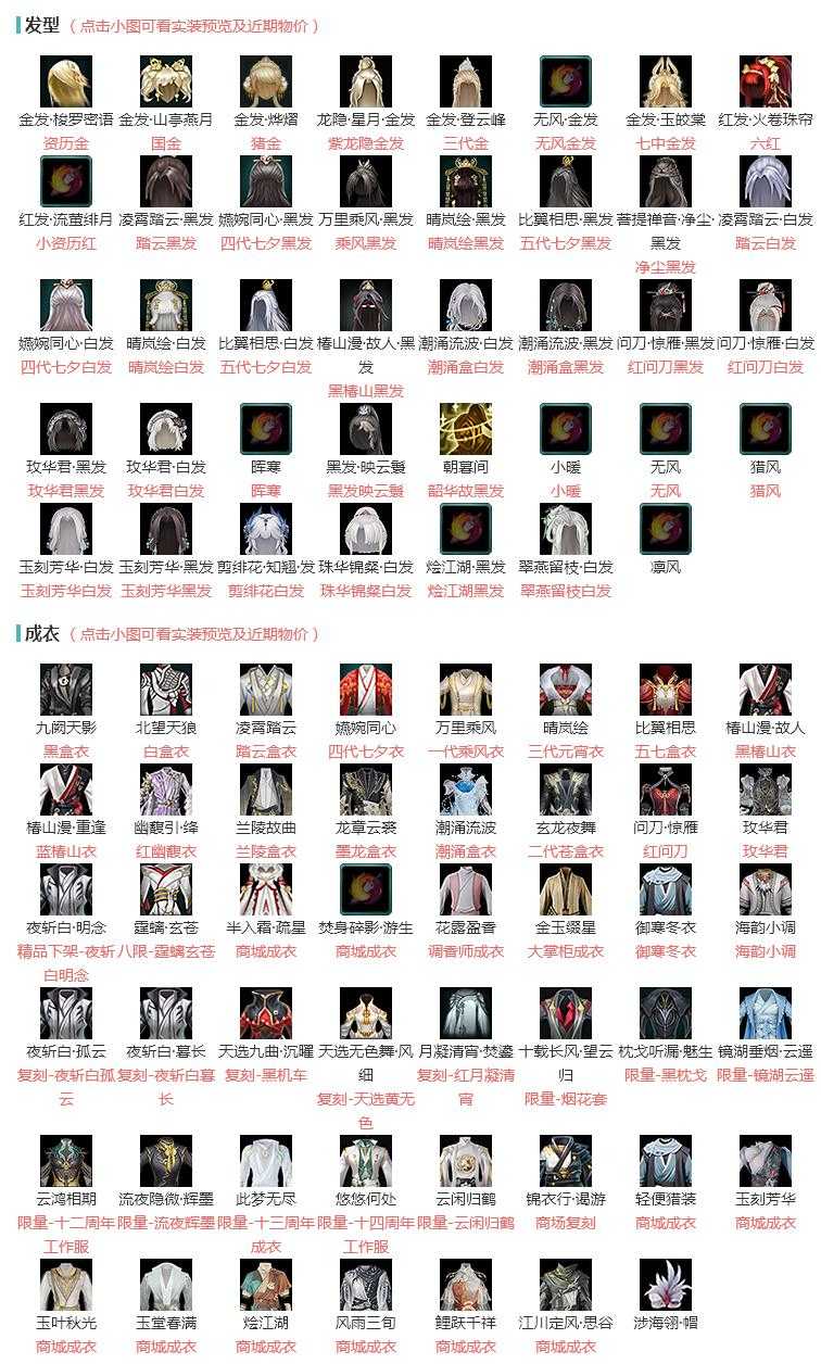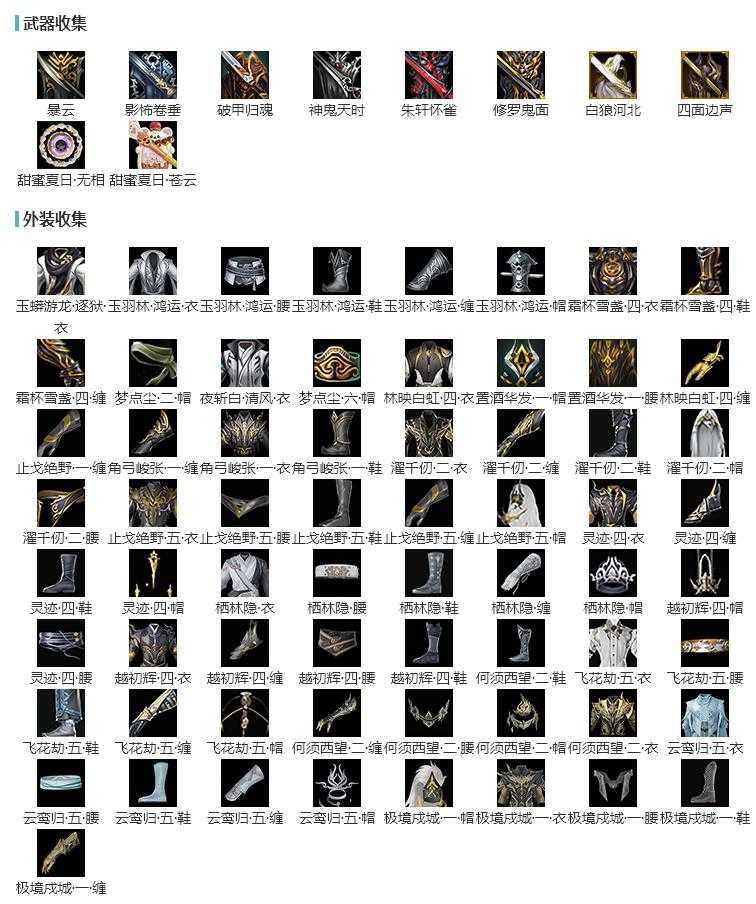 限时限量:[海韵小调, 流夜辉墨, 云闲归鹤, 霆螭玄苍, 镜湖云遥, 烟花套, 黑枕戈, 十三周年成衣, 十四周年工作服, 十二周年工作服]