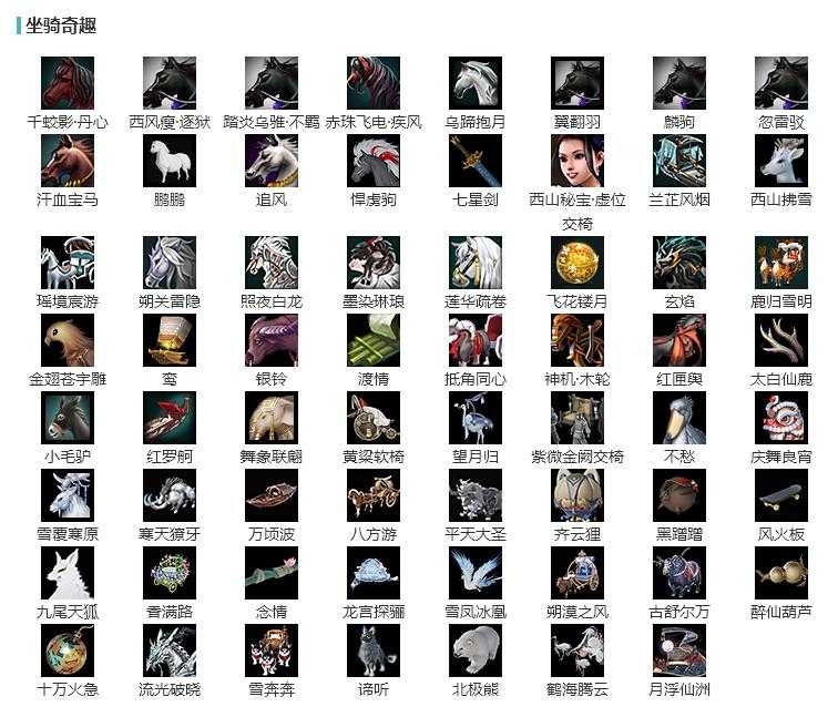 【坐骑】6个[踏炎不羁, 西风瘦逐狱, 赤珠疾风, 乌蹄抱月, 千蛟影丹心, 鹏鹏]