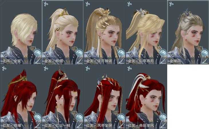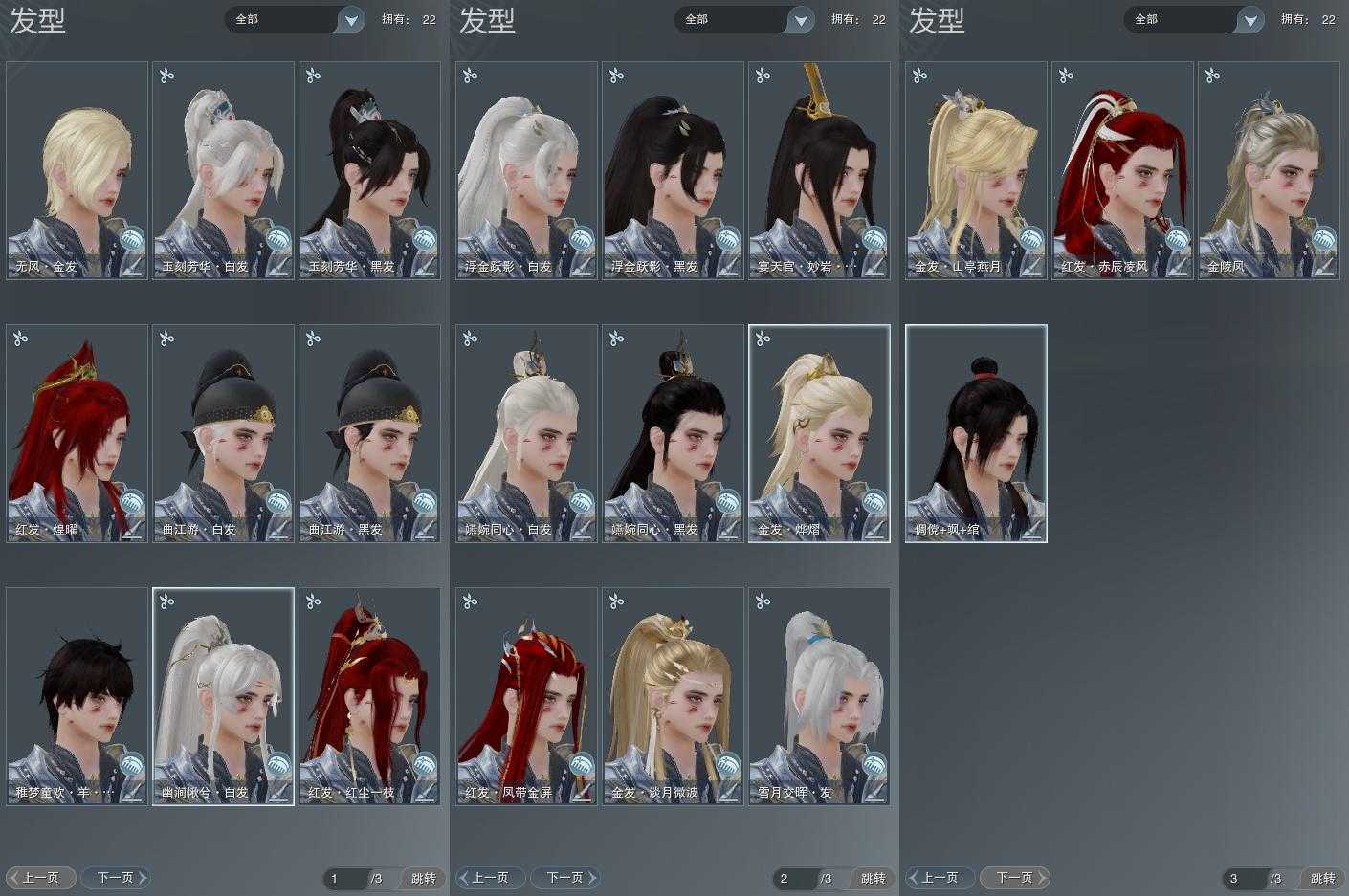 【发型】金发5个[一代金, 国金, 倒闭金, 猪金, 无风金发], 红发4个[八红, 十二红, 狗红, 兔红], 黑发6个, 白发6个, 盒子发型[曲江游白发, 四代七夕黑发, 雪月白发, 四代七夕白发, 黑狮黑发, 小金龙黑发, 小金龙白发, 羊盒黑发, 曲江游黑发, 幽涧愀兮白发], 总页数3