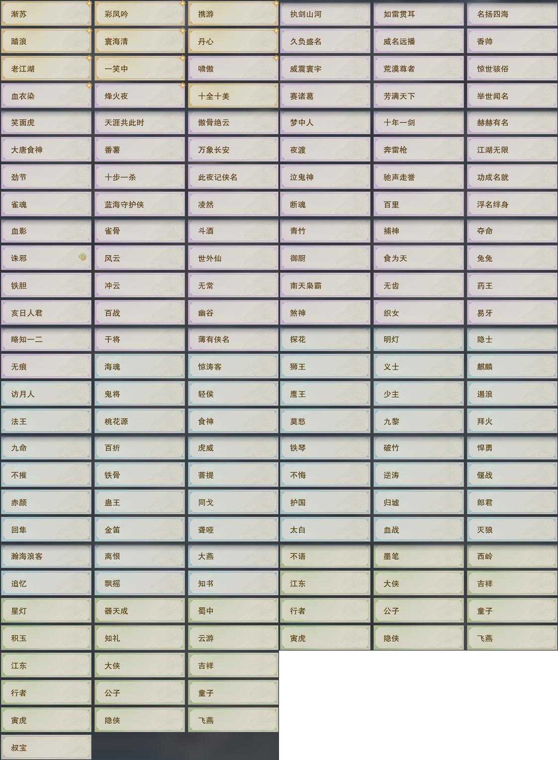 【奇珍】19个[归乡路, 孩童书, 稚子心, 滇南行, 青草歌, 破晓鸣, 沙海谣, 关外商, 北行镖, 戎马边]