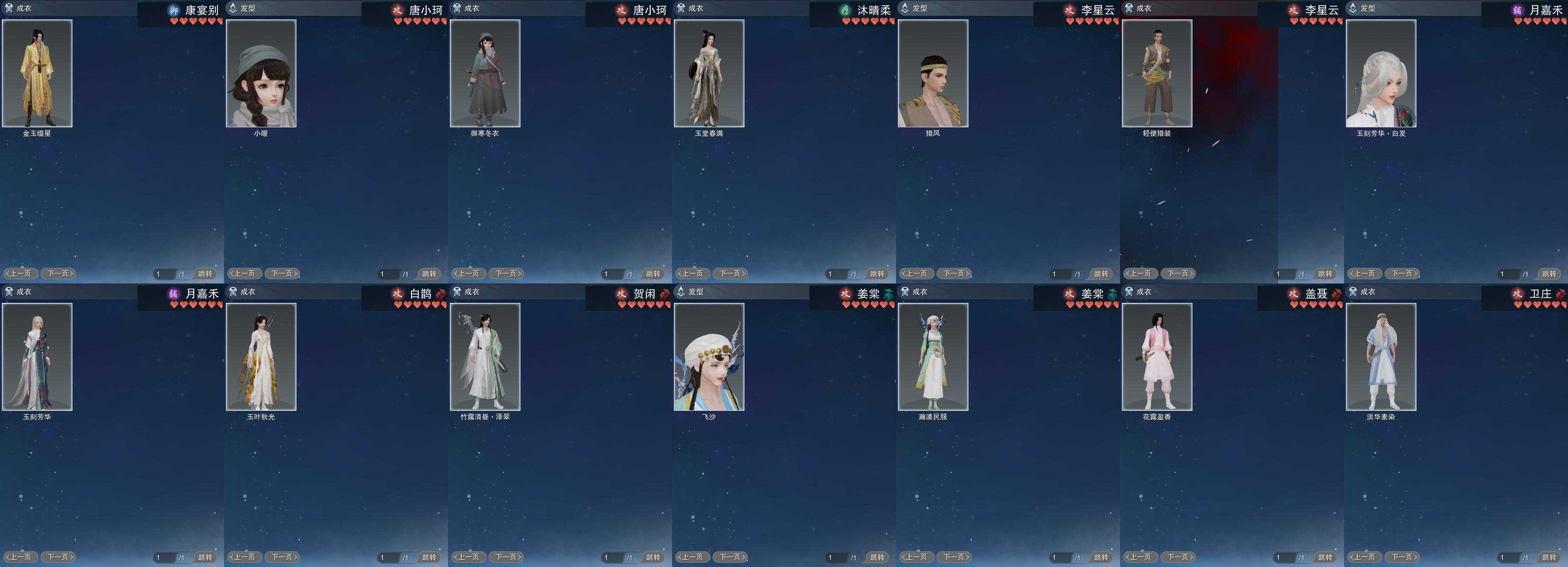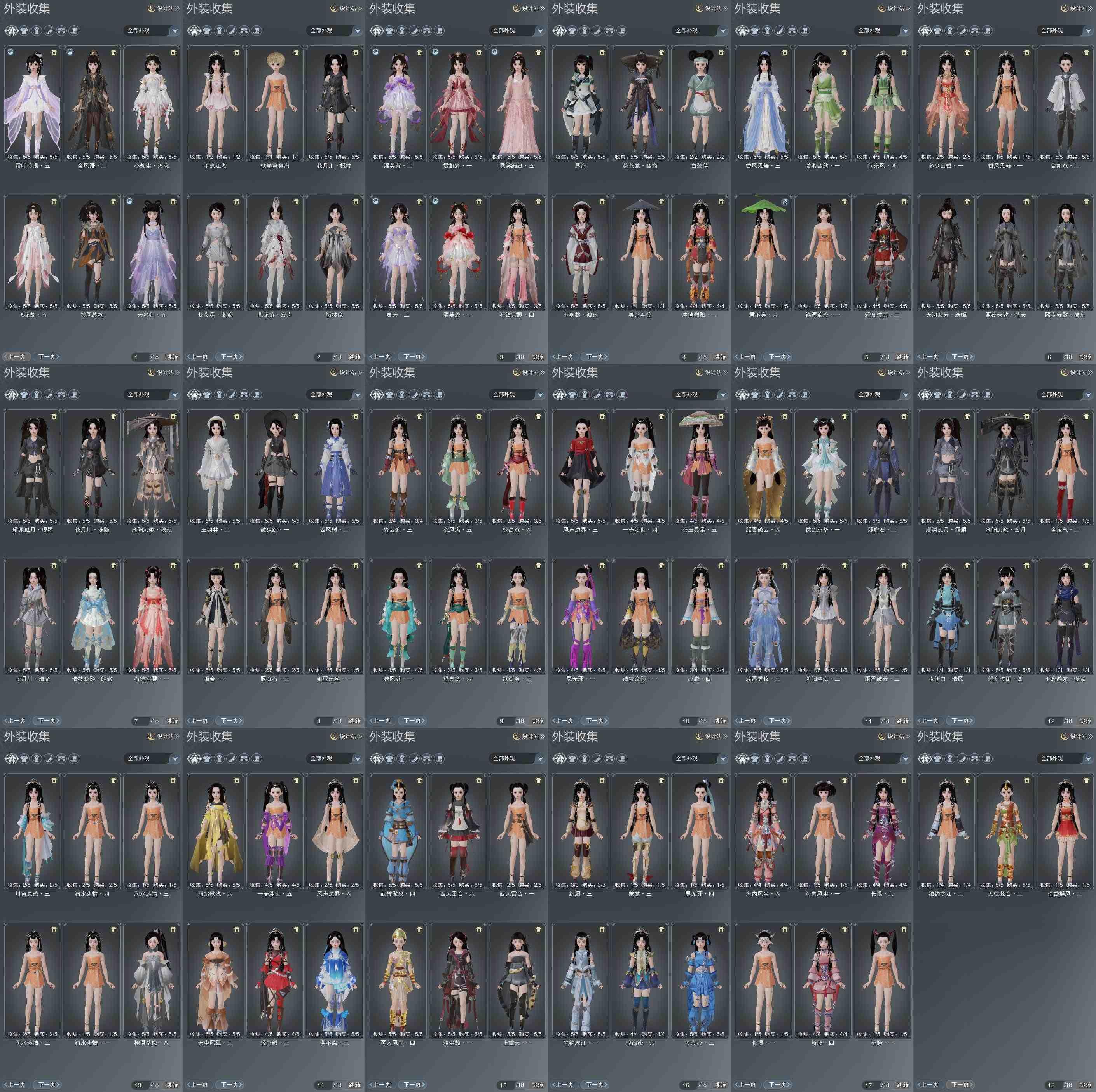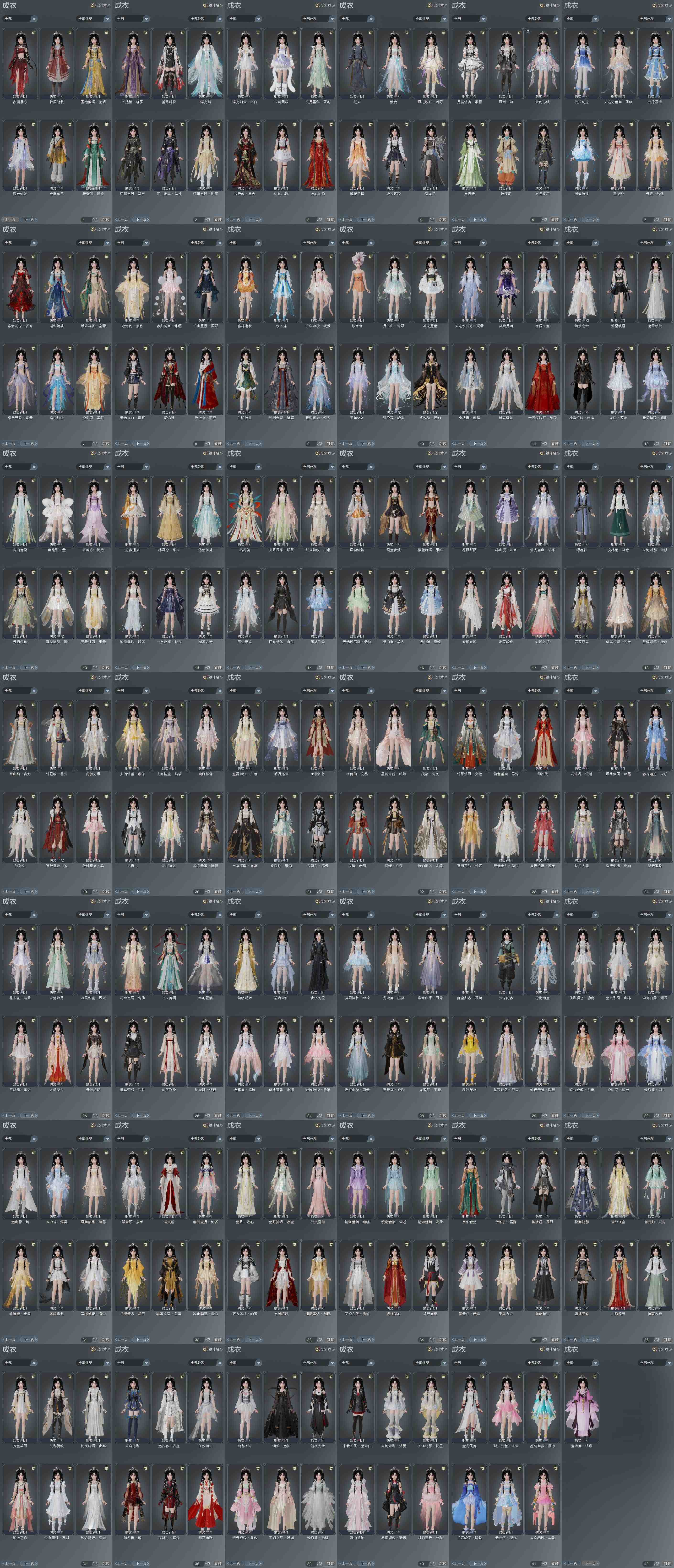 限时限量:[富婆套, 兰庭凤香, 点春晴, 重华绯仪, 海韵小调, 白玫瑰, 雪衣寒月, 粉封川, 蓝舞步, 望云山椿, 十三万资历衣, 侠影静庭, 十六万资历衣, 冷霜霏微, 冷霜槛菊, 中宵渊霜, 金浮琅玉, 锦夜游霜风, 瀚漠民服, 牧原胡装, 烟花套, 白枕戈, 镜湖吹荷, 镜湖云遥, 镜湖踏晓, 镜湖阑珊, 琴台顾素手, 点寒星樱尾, 夜沉列星, 锦绣明辉, 十二周年工作服, 玉悬窗棠语, 客行逍遥夜影, 客行逍遥撷英, 客行逍遥天旷, 小黑龙衣, 巫歌如匕, 盈露川陵, 一期福袋成衣, 幽涧愀兮, 十三周年成衣, 蓝水母, 天河对影云砂, 蓝浪海, 庭落西风, 十四周年工作服, 云闲归鹤, 蓝绮阁, 浮光绡, 蓝碧海]