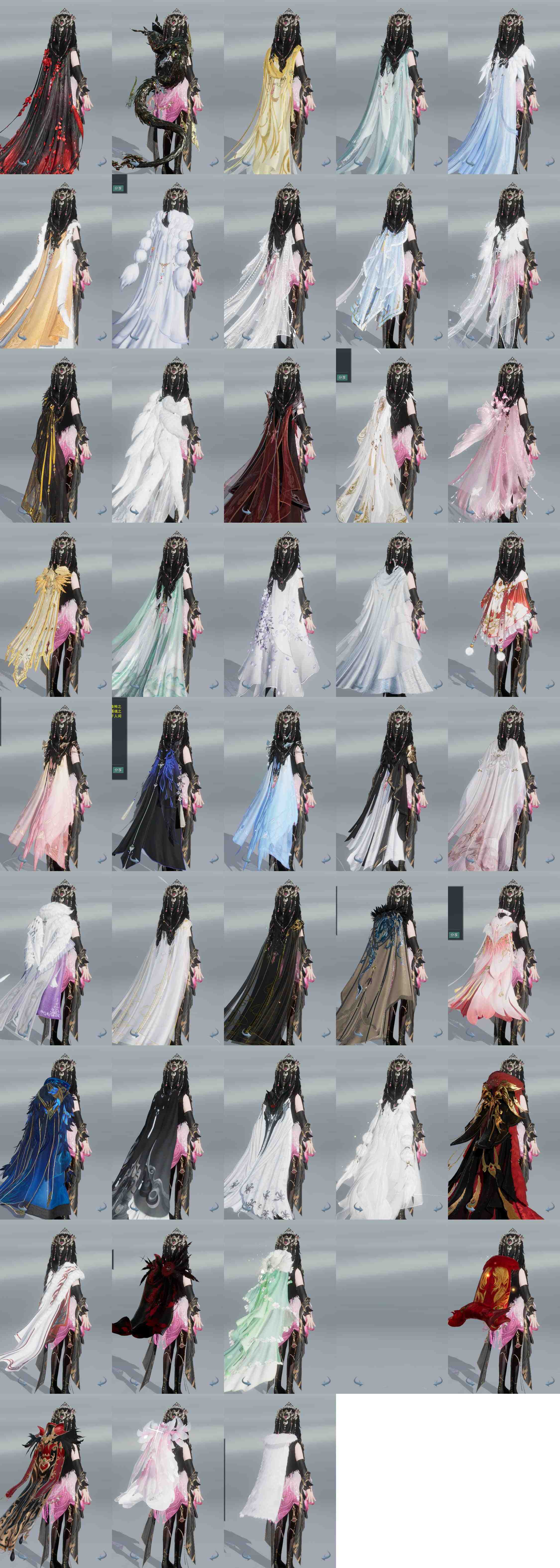 复刻:[白白菜, 望月欢心, 策马雪月, 银罗姆, 罗姆婵娟, 沧海间湘月, 沧海间琼台, 贺华岁霜降, 彩云归素青, 风华深冕, 天河清晏, 复刻蓝水云, 仙侣洗碧, 天河枕星, 墨韵绯烟, 黑机车, 复刻白二娃, 天选黄无色, 白月凝清宵, 复刻绿不欺, 紫天选繁, 夜斩白孤云, 绿天选繁, 夜斩白暮长, 彩云归若霞, 榆塞吹角, 沧海间烟暮, 沧海间垂虹, 凤舆皇华, 谁家风兮, 谁家雨兮, 龙鸾舞振灵, 龙鸾舞千花, 花非花银桃, 花非花晴荼, 五期福袋成衣, 夜隐仙玄葵, 夜隐仙素菊, 复刻粉玄月, 复刻白纤云, 复刻黄绸云, 复刻紫香凝, 黄云霆]