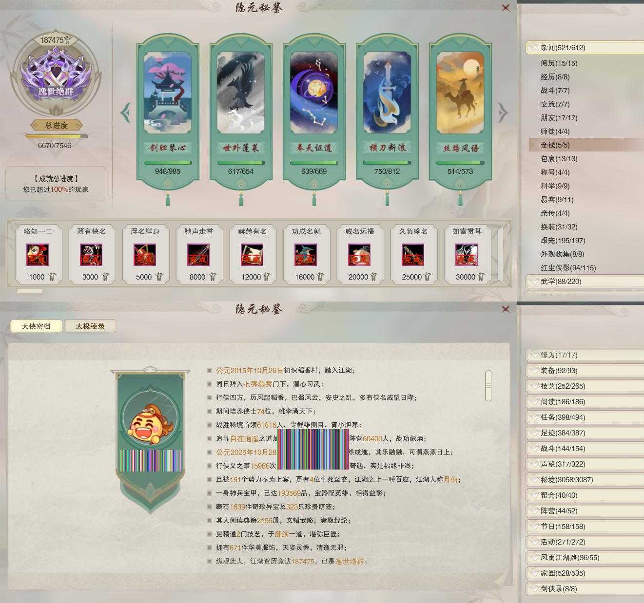【奇遇】53个[白日梦, 天涯无归, 三山四海, 劝学记, 雪山恩仇, 阴阳两界, 莫负初心, 兔江湖, 平生心愿, 黑白路, 惜往日, 乱世舞姬, 塞外宝驹, 争铸吴钩, 韶华故, 虎啸山林, 济苍生, 护佑苍生, 少年行, 故园风雨, 扶摇九天, 三尺青锋, 流年如虹, 舞众生, 清风捕王, 侠行囧途, 寻猫记, 茶馆奇缘, 入蛟宫, 庆舞良宵]