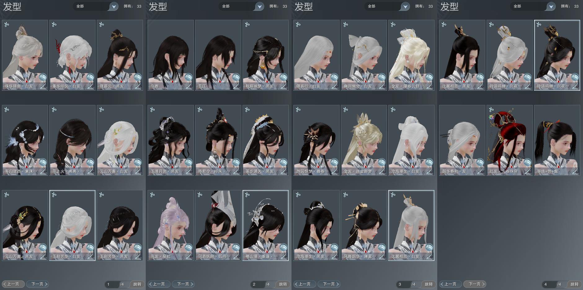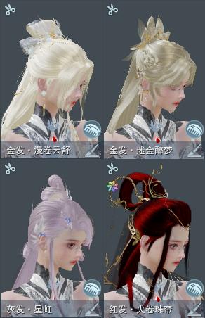 【发型】金发2个[牛金, 云金], 红发2个[六红, 二代灰], 黑发18个, 白发10个, 盒子发型[二代七夕白, 黑楼兰黑发, 五代七夕黑发, 黑楼兰白发, 五代七夕白发, 薄雾黑发, 沧海黑发, 红游园黑发, 沧海白发, 幽涧愀兮白发, 镖盒白发, 蓝椿山黑发, 红白妖眸盒黑发, 西游盒黑发, 红持君盒黑发, 八七盒黑发, 六代重阳黑发, 红上火黑发, 蓝陇西黑发], 总页数4