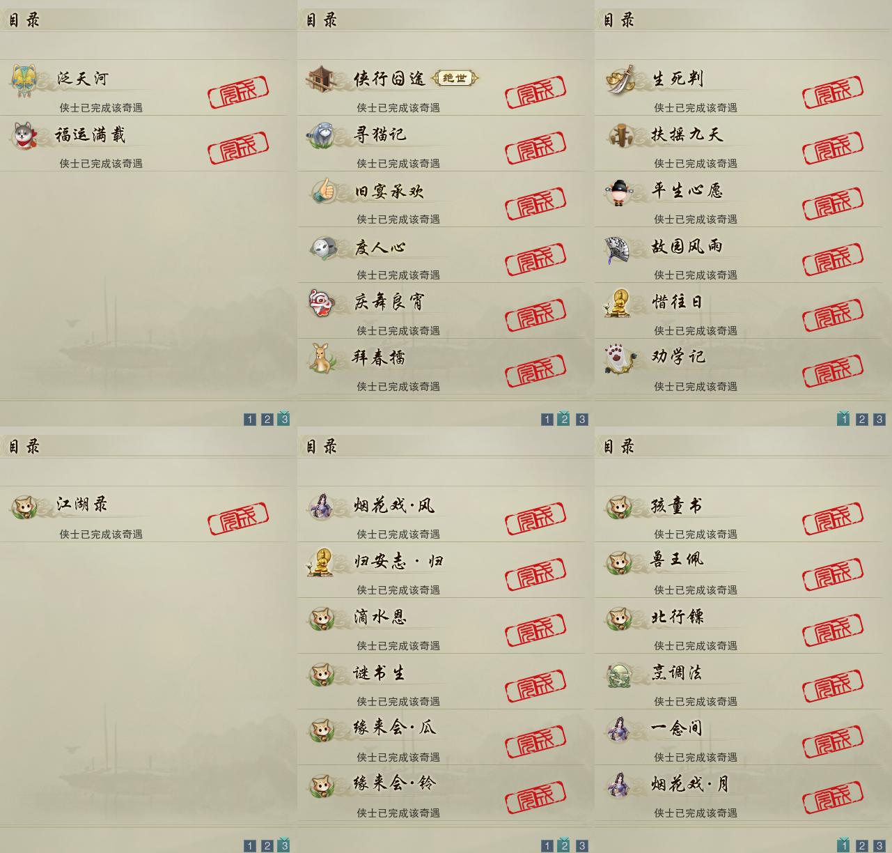 【奇遇】14个[劝学记, 平生心愿, 惜往日, 扶摇九天, 故园风雨, 侠行囧途, 寻猫记, 庆舞良宵, 生死判, 度人心, 旧宴承欢, 泛天河, 拜春擂, 福运满载]