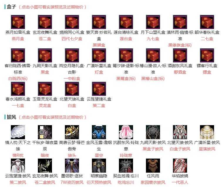 盒子:[黑盒, 一七盒, 二七盒, 四代七夕盒, 一中粉盒, 灯盒, 白盒, 黑狮盒, 莲台盒, 镖盒, 卿酒盒, 苍二盒, 灵龙盒, 策二盒, 黑傣族盒(标), 黑椿山盒(标), 九七盒, 燕月盒, 黑鹭盒(标), 白陇西(标)]