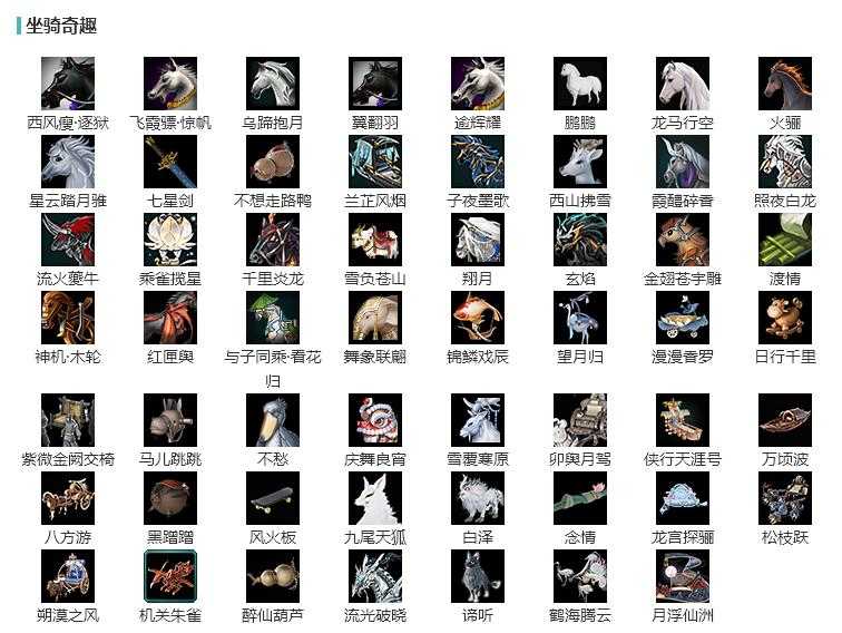 【坐骑】6个[西风瘦逐狱, 星云踏月骓, 飞霞骠惊帆, 乌蹄抱月, 白龙马, 鹏鹏]