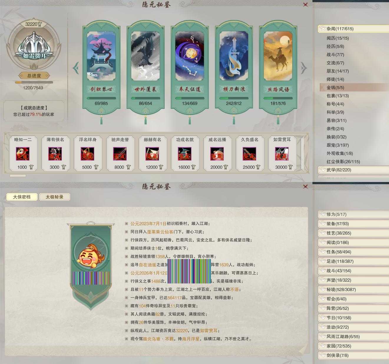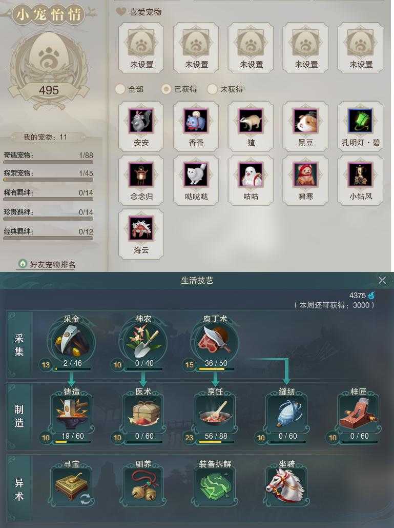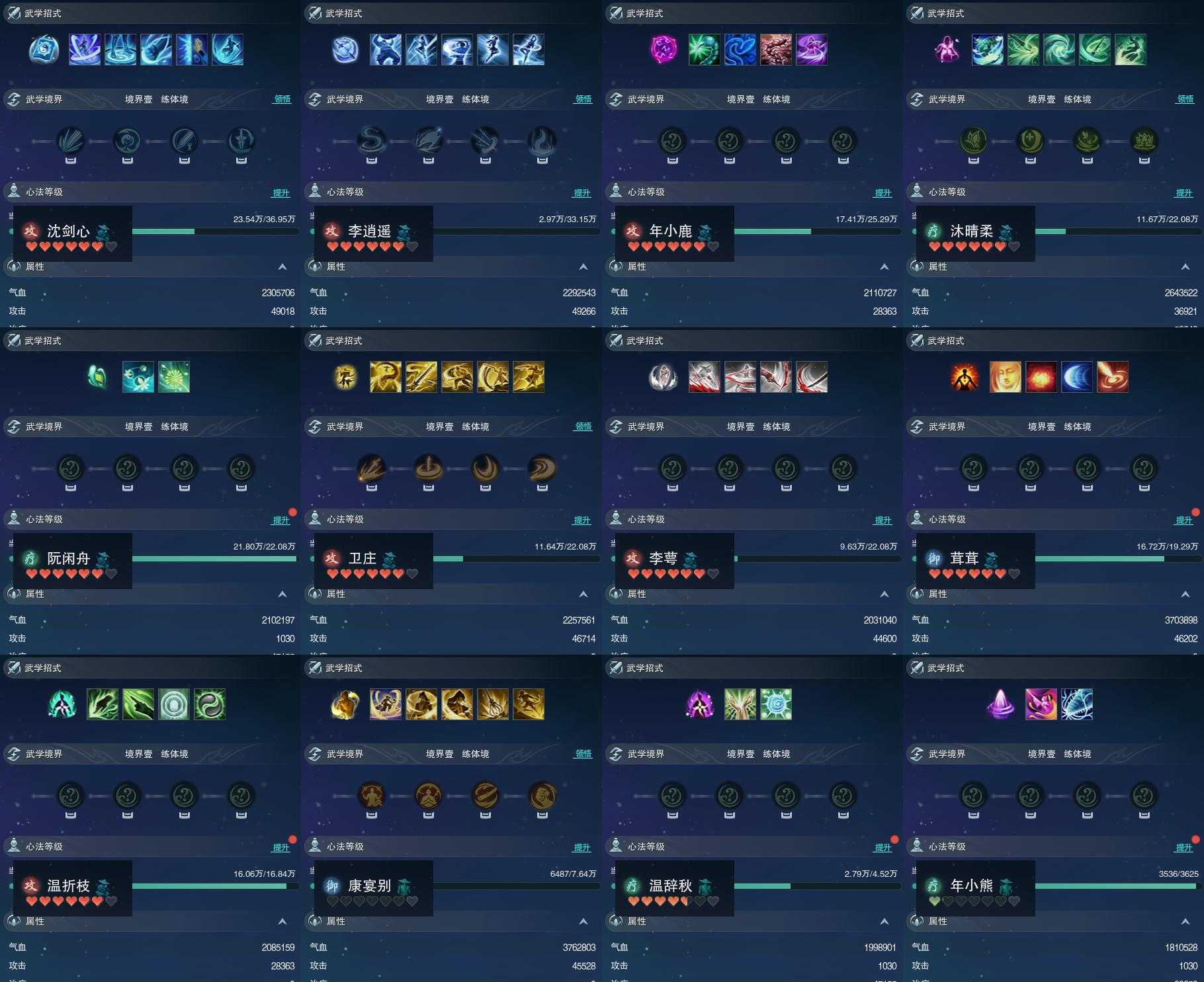 【同伴】沈剑心78级境界壹,李逍遥76级境界壹,年小鹿74级境界壹,沐晴柔73级境界壹,阮闲舟73级境界壹,卫庄意73级境界壹,李萼意73级境界壹,茸茸72级境界壹,温折枝71级境界壹,康宴别65级境界壹,温辞秋61级境界壹,年小熊39级境界壹