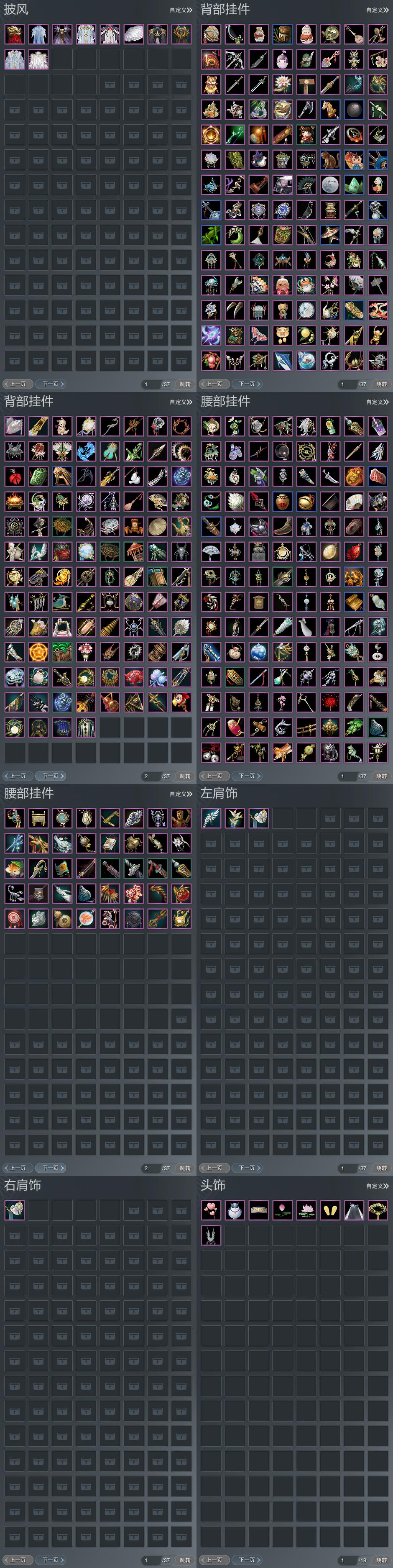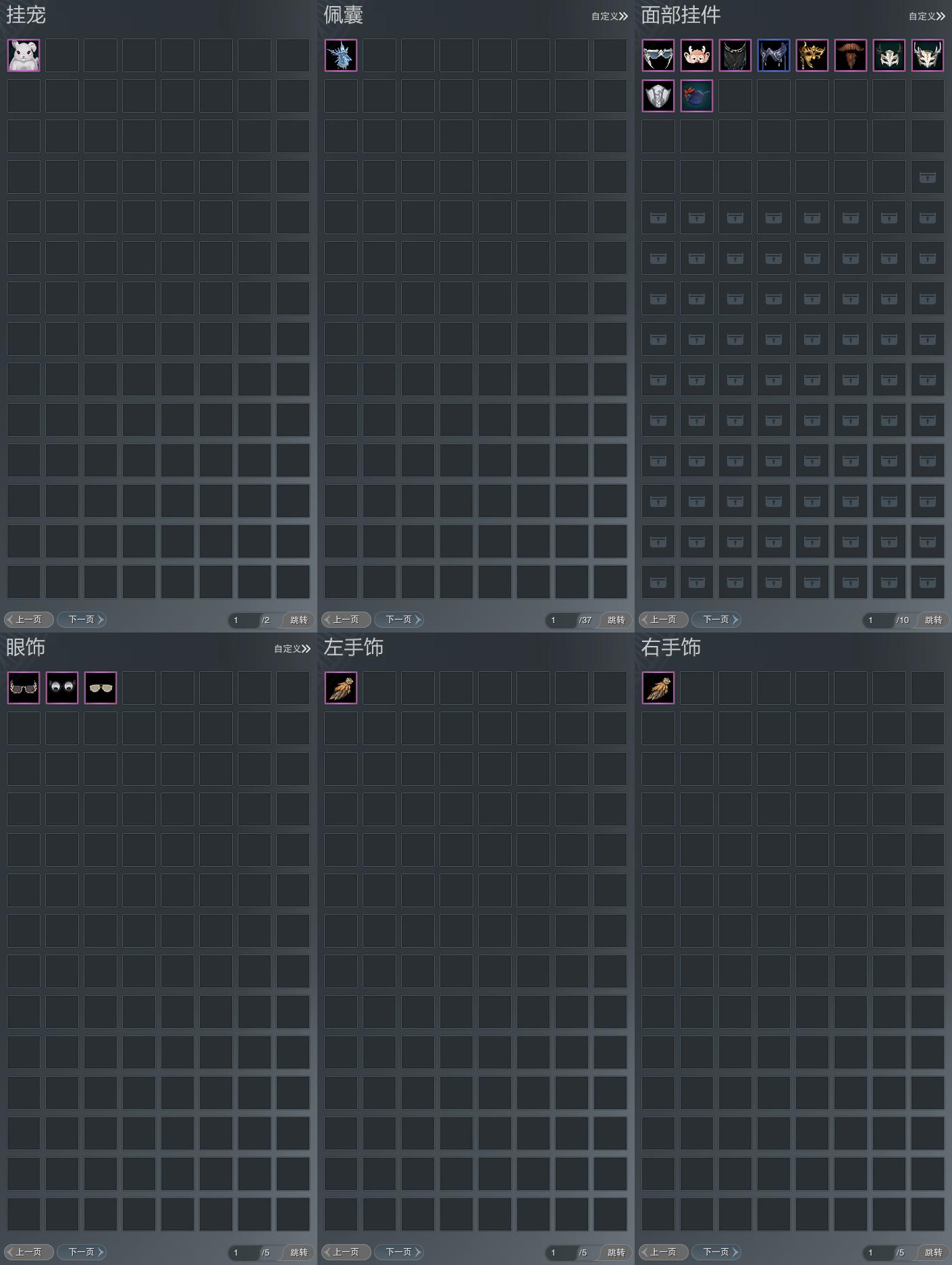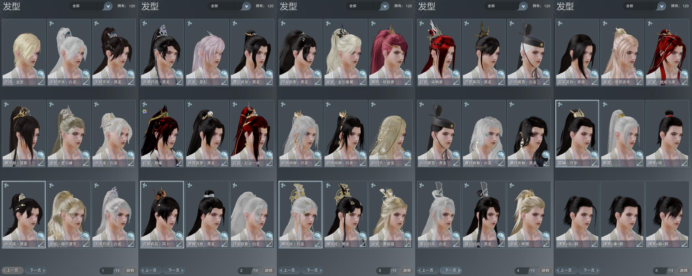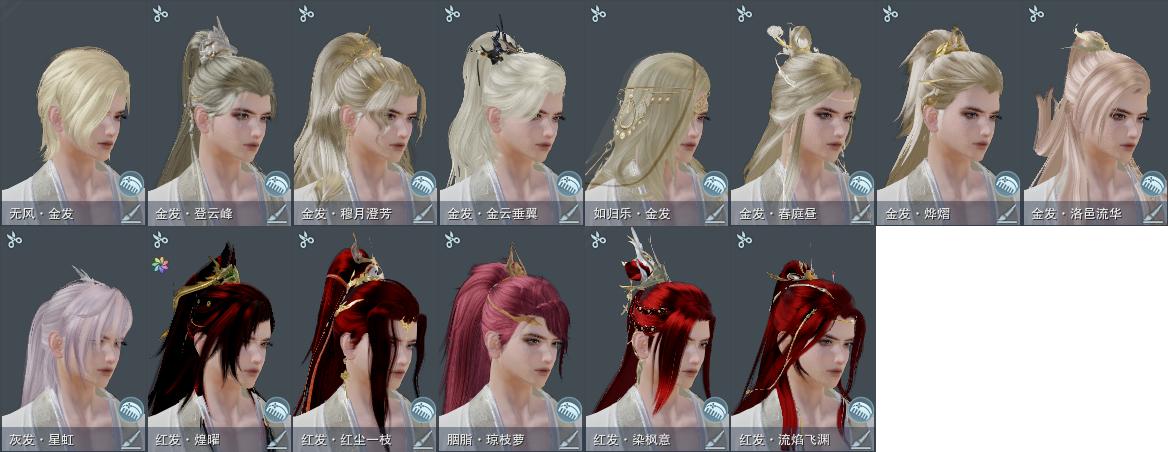 【发型】金发8个[鼠金, 玫瑰金, 猪金, 苍金, 如归金, 穆金, 三代金, 无风金发], 红发6个[九红, 十二红, 紫发, 鼠红, 兔红, 二代灰], 黑发19个, 白发10个, 盒子发型[二代花朝黑, 丝路黑, 乘风黑发, 晴岚绘黑发, 山吹樱雪黑发, 黑楼兰黑发, 二代花朝白, 丝路白, 晴岚绘白发, 山吹樱雪白发, 黑楼兰白发, 小金龙黑发, 小熊黑发, 小金龙白发, 红六七黑发, 花滑黑发, 八七盒黑发, 八七盒白发, 黑鹭黑发], 总页数5