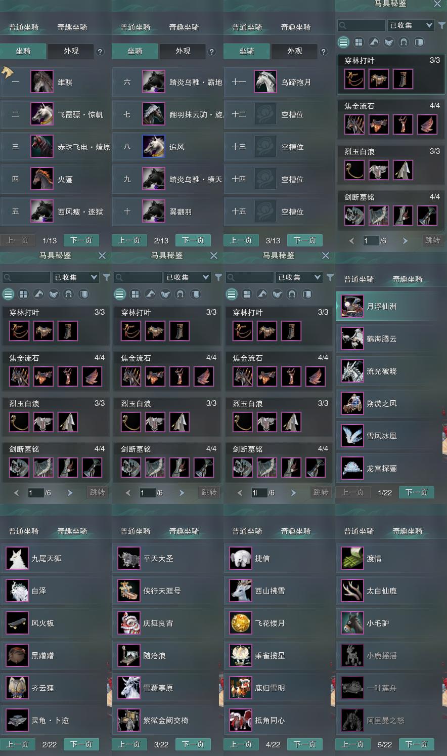 【坐骑】11个[踏炎横天, 踏炎霸地, 赤珠燎原, 西风瘦逐狱, 飞霞骠惊帆, 乌蹄抱月, 翻羽抹云驹旋风, 维骐]