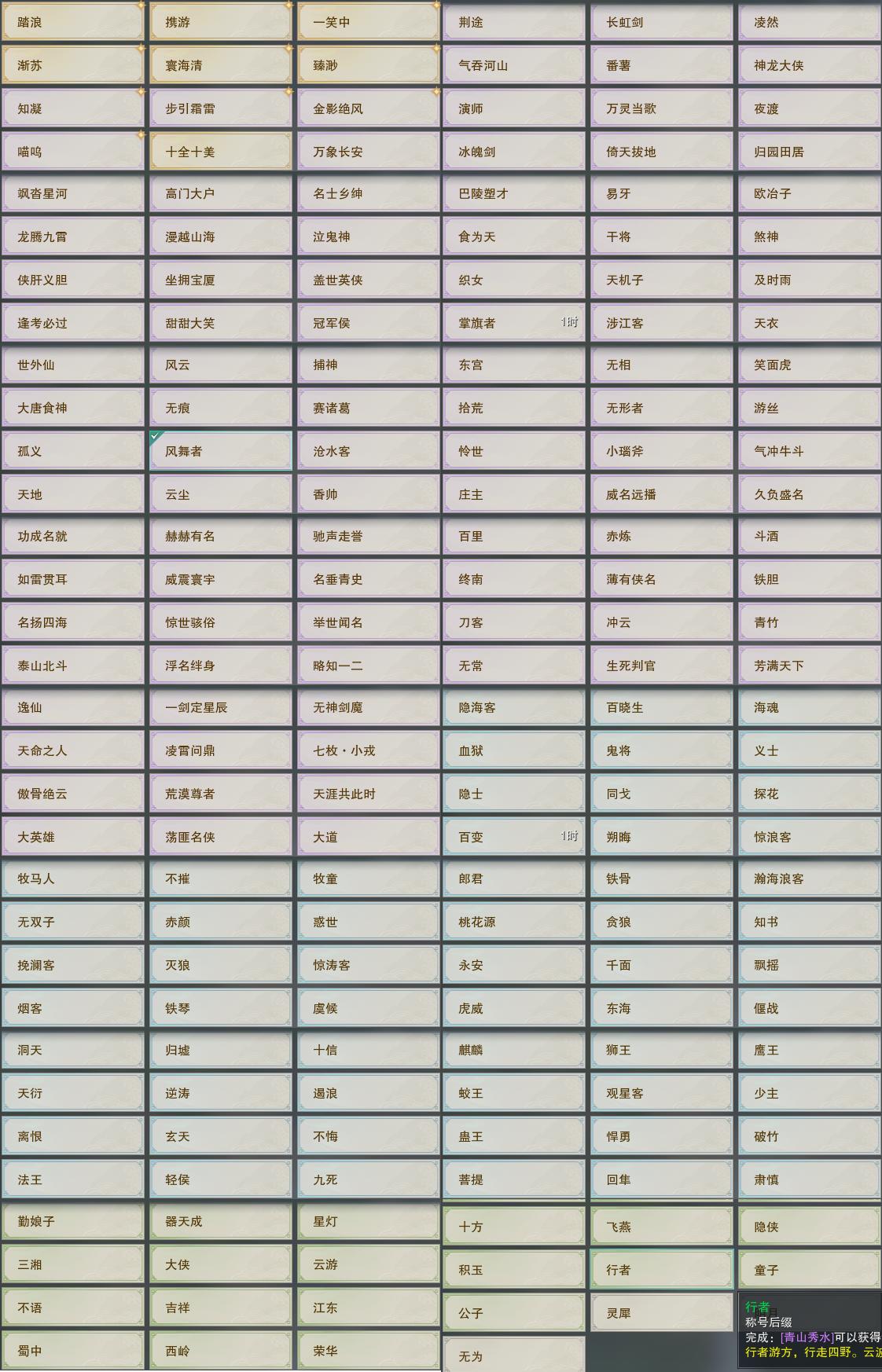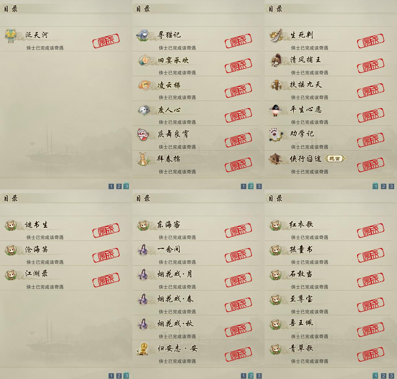 【奇遇】13个[劝学记, 平生心愿, 扶摇九天, 清风捕王, 寻猫记, 侠行囧途, 庆舞良宵, 生死判, 凌云梯, 度人心, 旧宴承欢, 泛天河, 拜春擂]