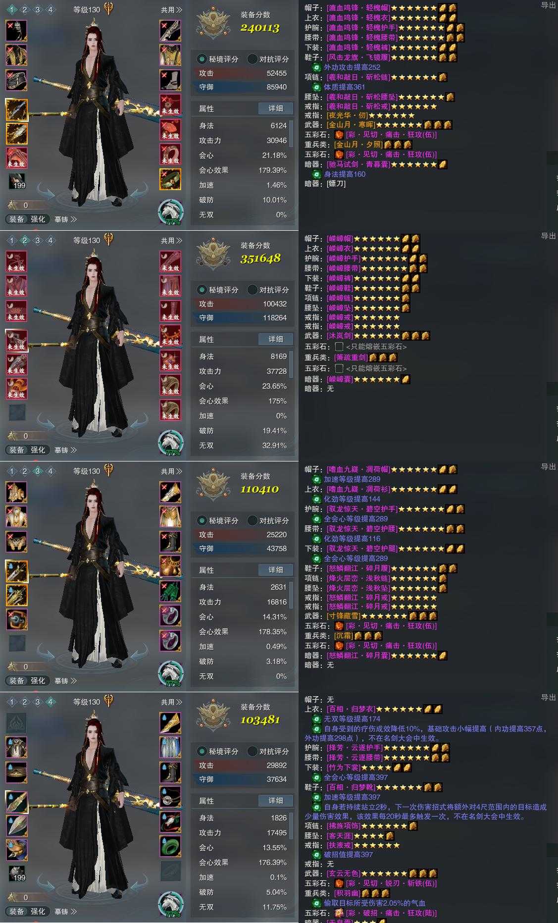 【装备】130级,装备一240113,装备二351648,装备三110410,装备四103481