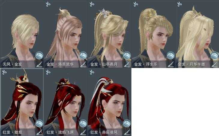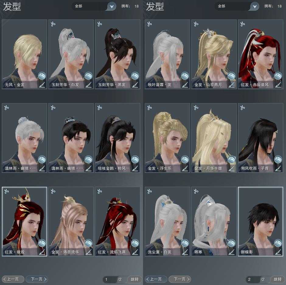 【发型】金发5个[鸡金, 喵金, 国金, 玫瑰金, 无风金发], 红发3个[八红, 九红, 猪红], 黑发5个, 白发5个, 盒子发型[一代重阳白, 白琼枝黑发, 黑傣族黑发, 黑傣族白发], 总页数2