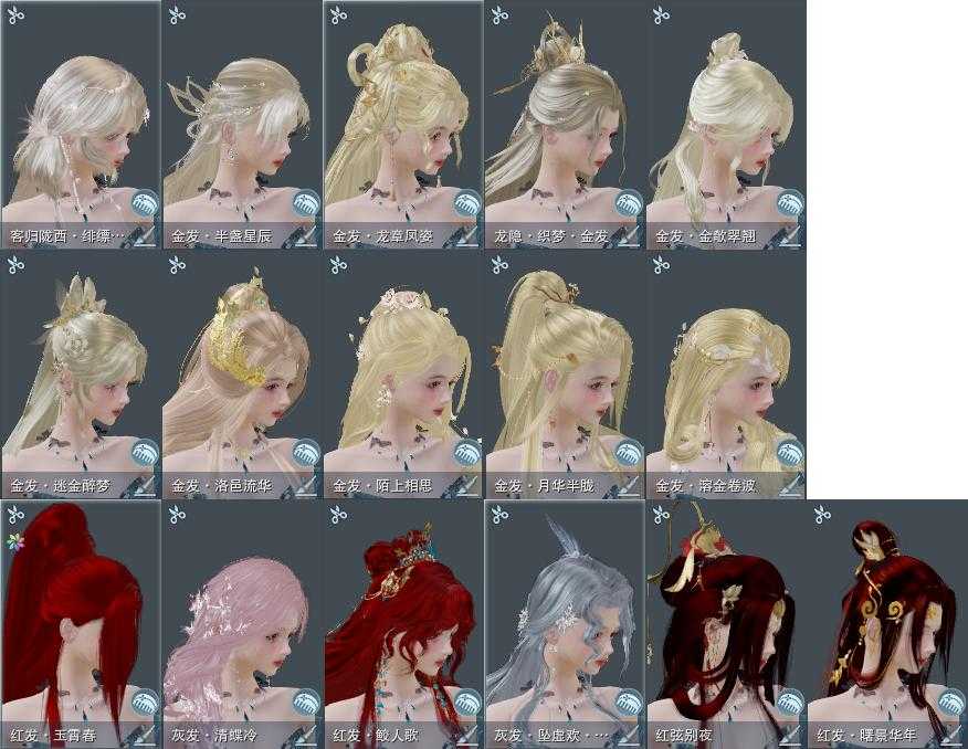【发型】金发11个[鸡金, 蝶金, 考金, 玫瑰金, 牛金, 四代中秋金, 龙金, 玄江金发, 精灵金, 白龙隐金发, 粉陇西金发], 红发6个[蝶粉, 猴红, 鸡红, 十五红, 马红, 三代灰银], 黑发19个, 白发14个, 盒子发型[一代七夕白, 二代七夕白, 四代中秋蓝黑发, 四代中秋蓝白发, 唐风韶颜黑发, 绿游园黑发, 唐风韶颜白发, 七中白盒黑发, 灵龙盒黑发, 灵龙白发, 梦盒黑发, 梦盒白发, 燕月盒黑发, 绿寻香黑发, 燕月盒白发, 仙剑白发, 绿毛衣黑发], 总页数6
