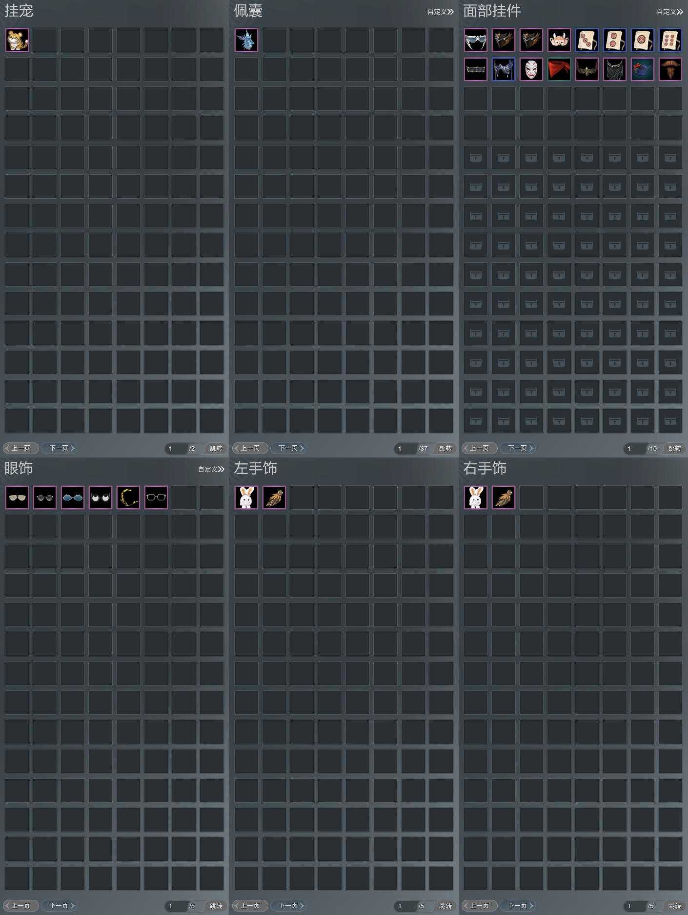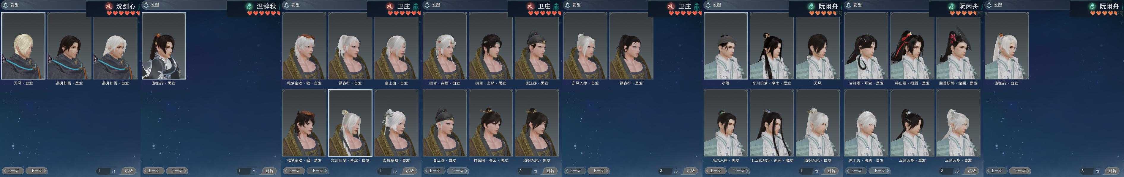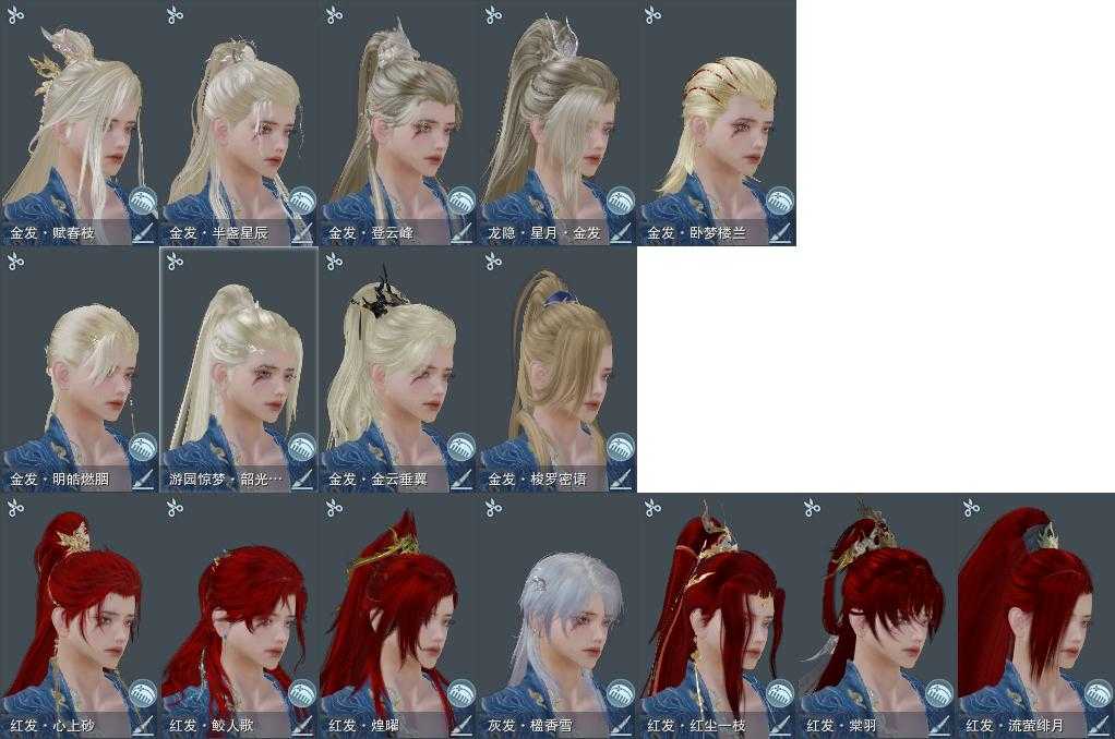 【发型】金发10个[资历金, 苍金, 双十二金发, 女仆金, 三代金, 无风金发, 精灵金, 蛇金, 新白游园金, 紫龙隐金发], 红发7个[十红, 十二红, 兔红, 小资历红, 十五红, 蛇红, 一代灰], 黑发25个, 白发19个, 盒子发型[曲江游白发, 四代七夕黑发, 小白龙黑发, 四代七夕白发, 小白龙白发, 十二黑, 黑懒猪黑发, 红懒猪白发, 紫忘川黑发, 狼盒黑发, 紫忘川白发, 红雨山前黑发, 七七黑发, 曲江游黑发, 狼盒白发, 竹露响暮云黑发, 七七白发, 白幽昙黑发, 幽涧愀兮白发, 镖盒黑发, 除夕盒黑发, 卿酒盒黑发, 镖盒白发, 红椿山黑发, 除夕盒白发, 卿酒盒白发, 红黑妖眸盒黑发, 黑藏袍黑发, 蓝观灯盒黑发, 龙吟盒黑发, 龙吟盒白发, 镰刀黑发, 镰刀白发, 红上火白发, 燕月盒黑发, 墨龙盒黑发, 燕月盒白发, 墨龙盒白发], 总页数4