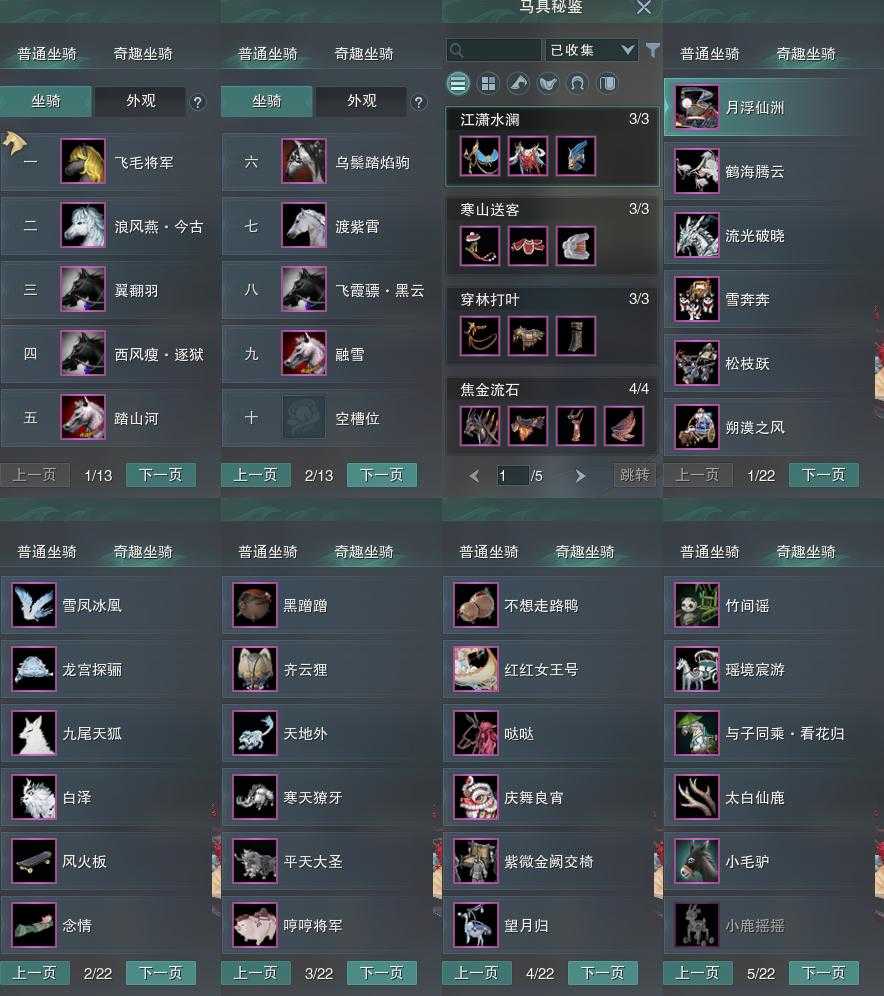 【坐骑】9个[西风瘦逐狱, 飞毛将军, 飞霞骠黑云, 浪风燕今古, 乌鬃踏焰驹]