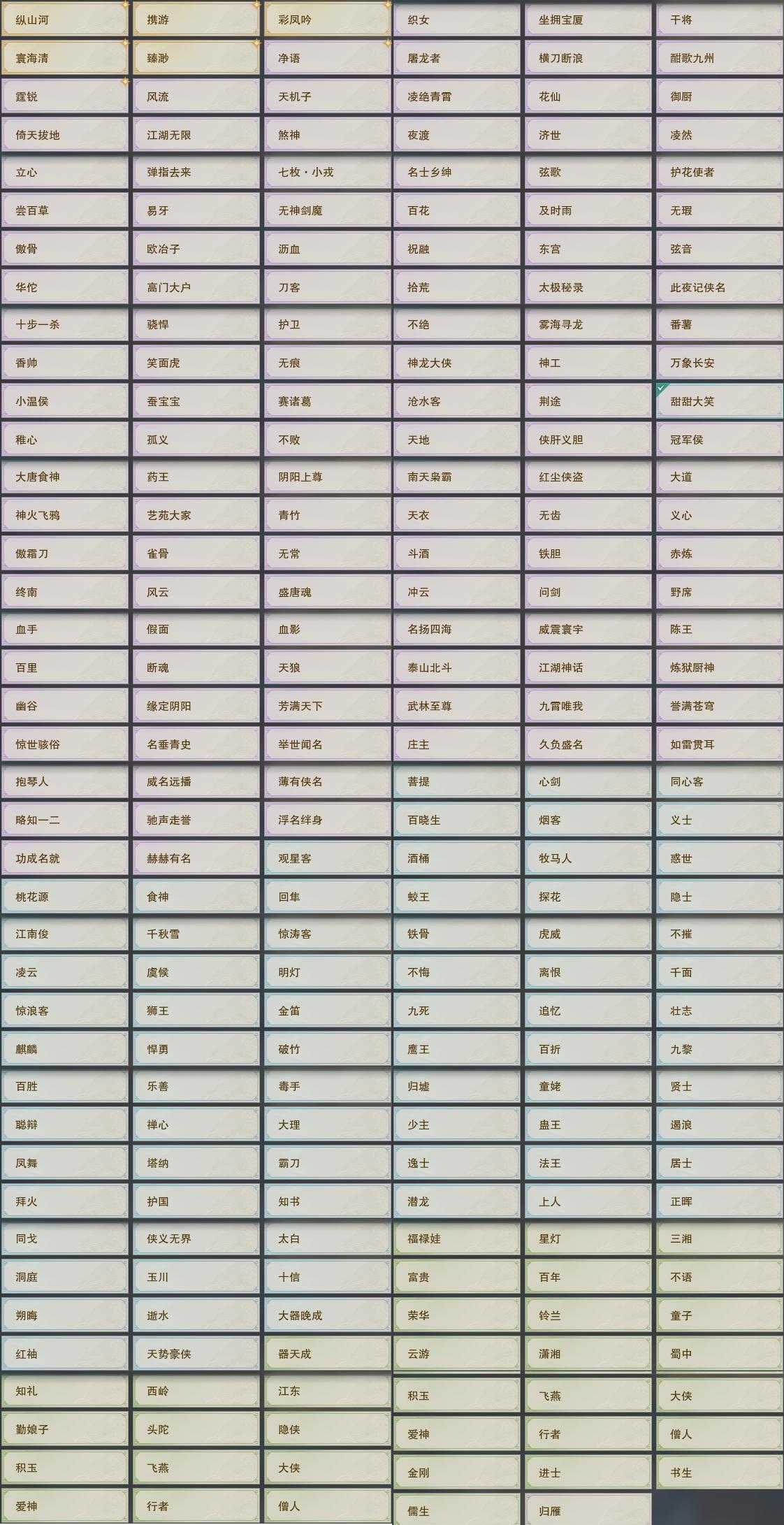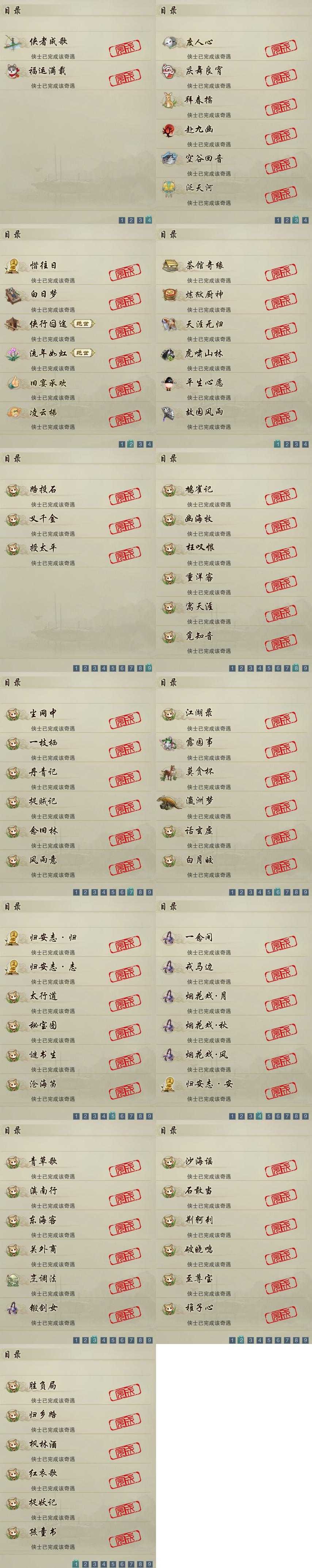 【奇遇】20个[白日梦, 天涯无归, 平生心愿, 惜往日, 虎啸山林, 故园风雨, 流年如虹, 侠行囧途, 茶馆奇缘, 庆舞良宵, 凌云梯, 炼狱厨神, 度人心, 赴九幽, 空谷回音, 旧宴承欢, 泛天河, 侠者成歌, 拜春擂, 福运满载]