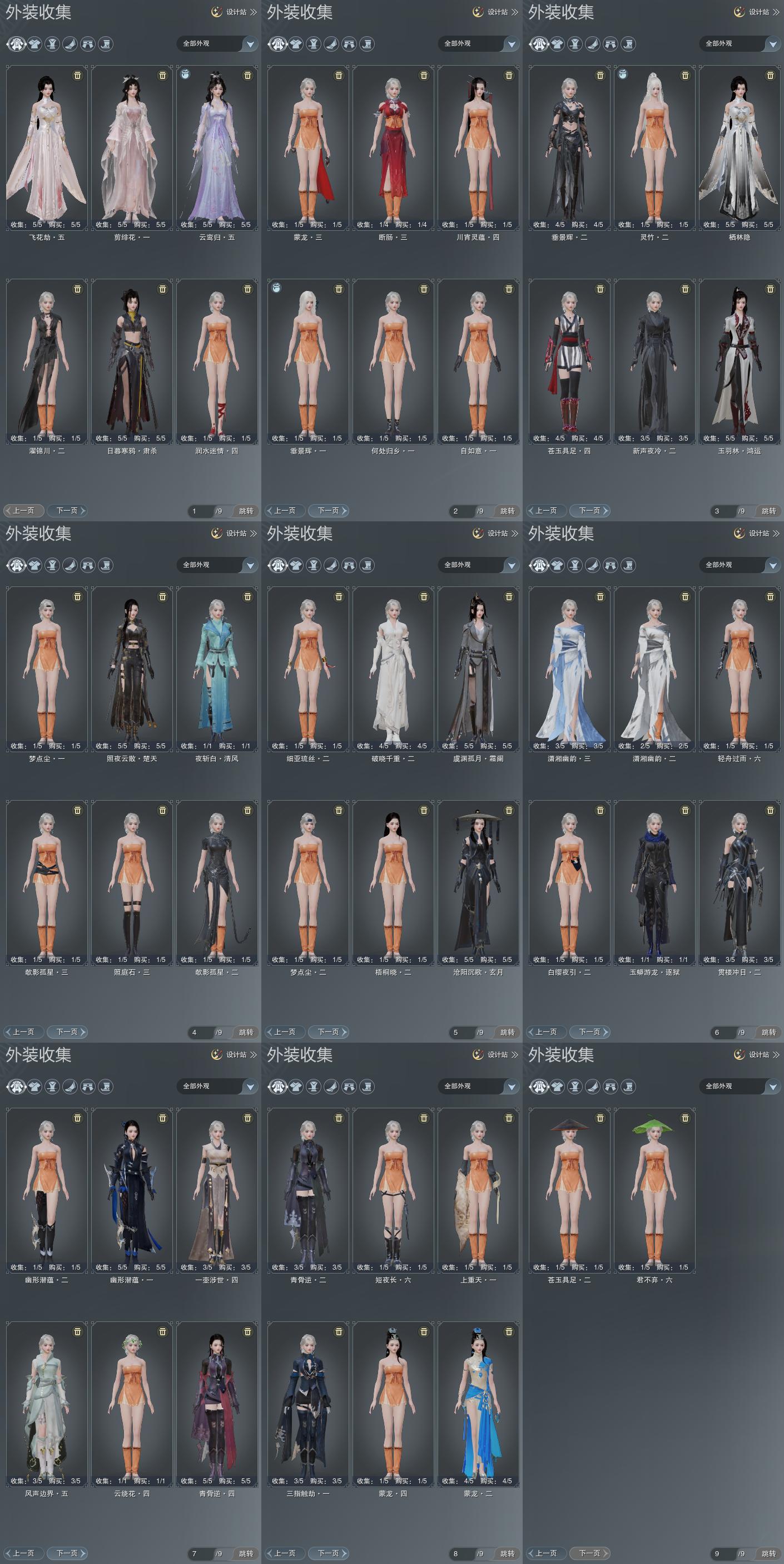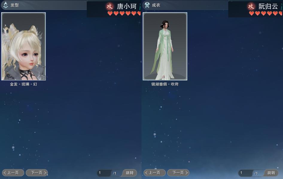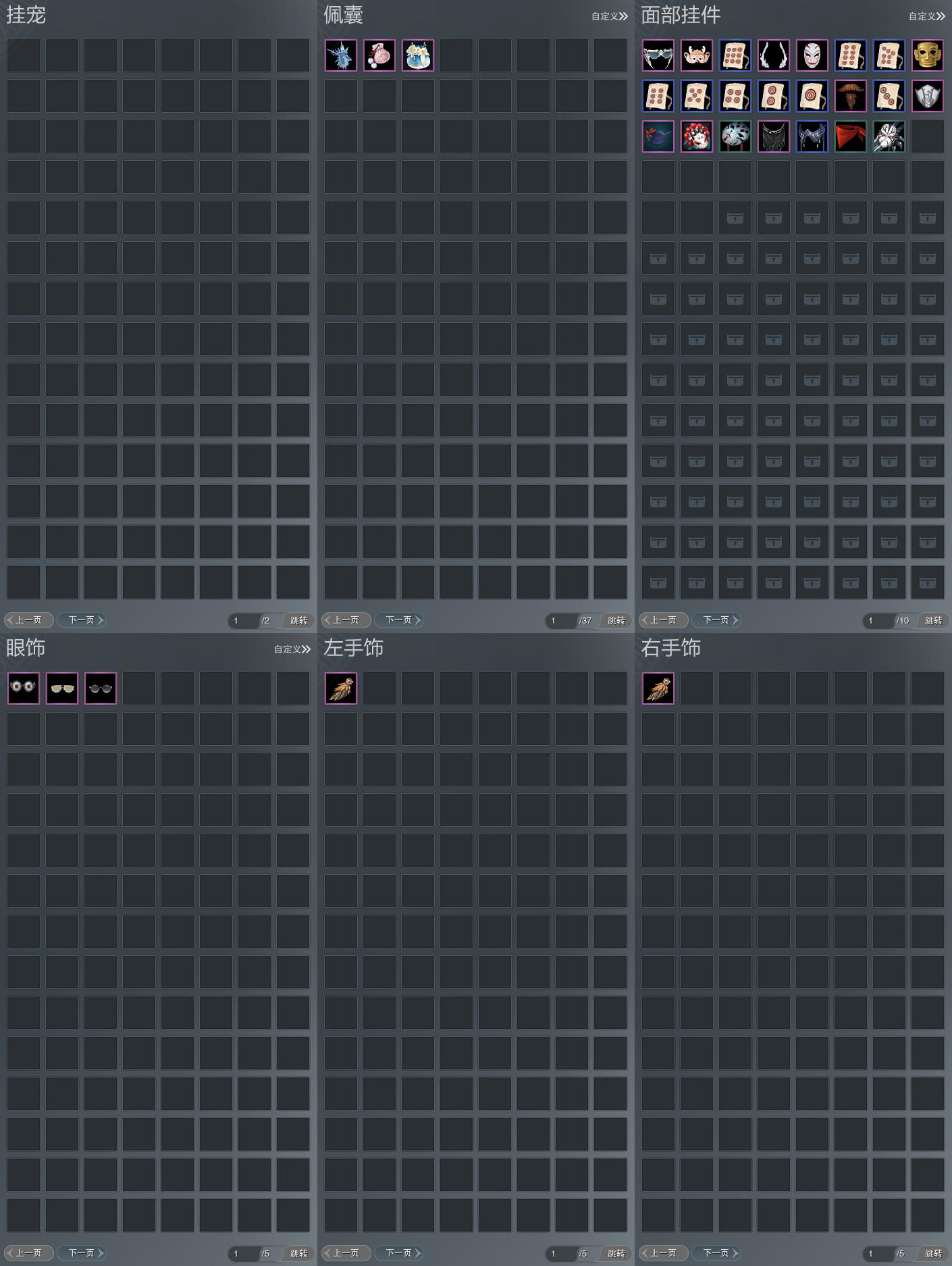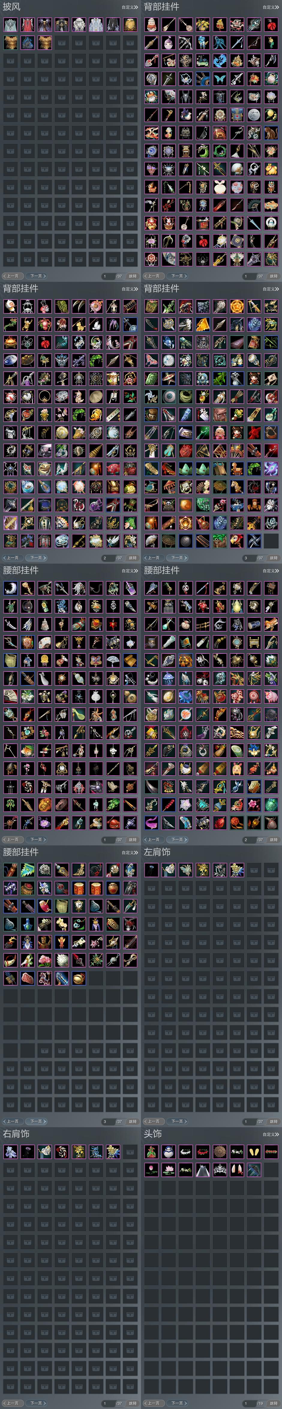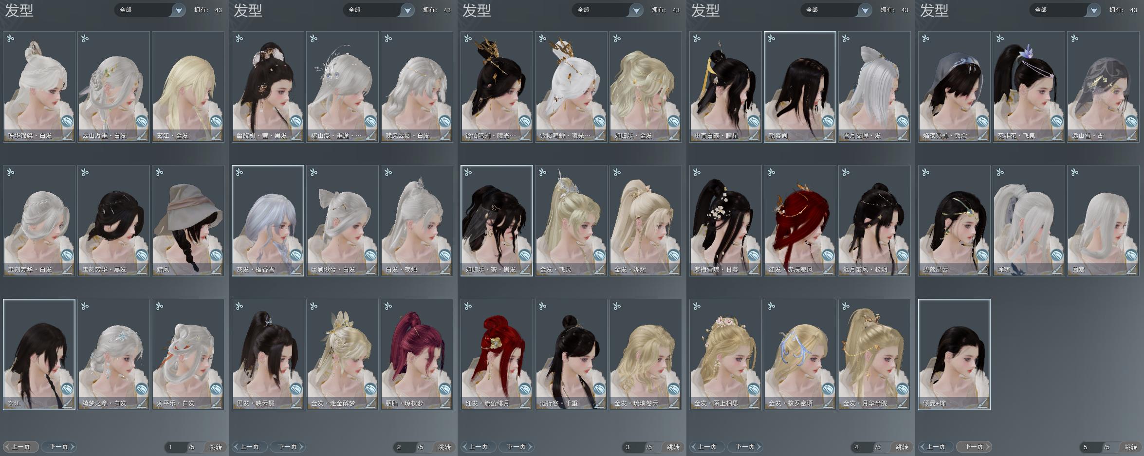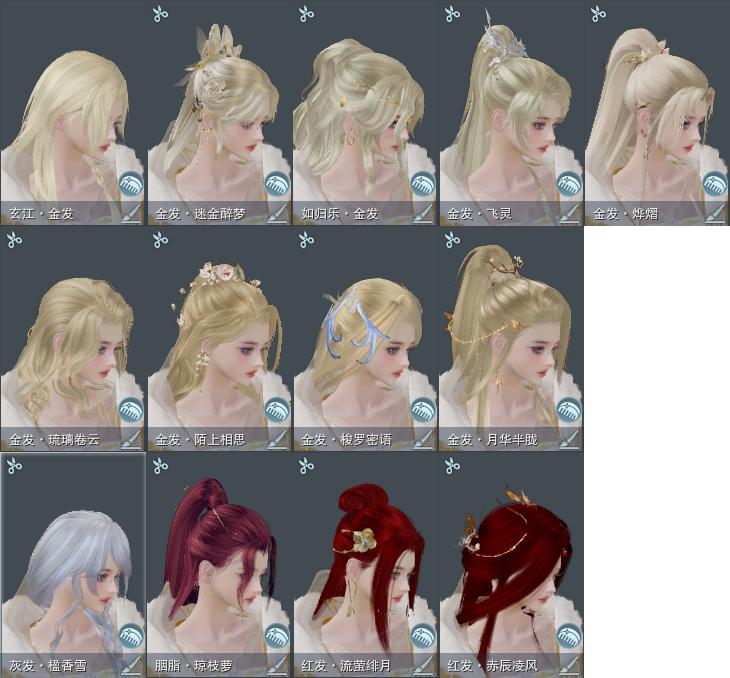 【发型】金发10个[资历金, 鸡金, 考金, 龙女金, 猪金, 飒金, 如归金, 牛金, 海金, 玄江金发], 红发4个[八红, 紫发, 小资历红, 一代灰], 黑发15个, 白发13个, 盒子发型[雪月白发, 白楼兰黑发, 白楼兰白发, 幽涧愀兮白发, 蓝椿山白发, 白幽馥黑发, 婚纱盒白发], 总页数5