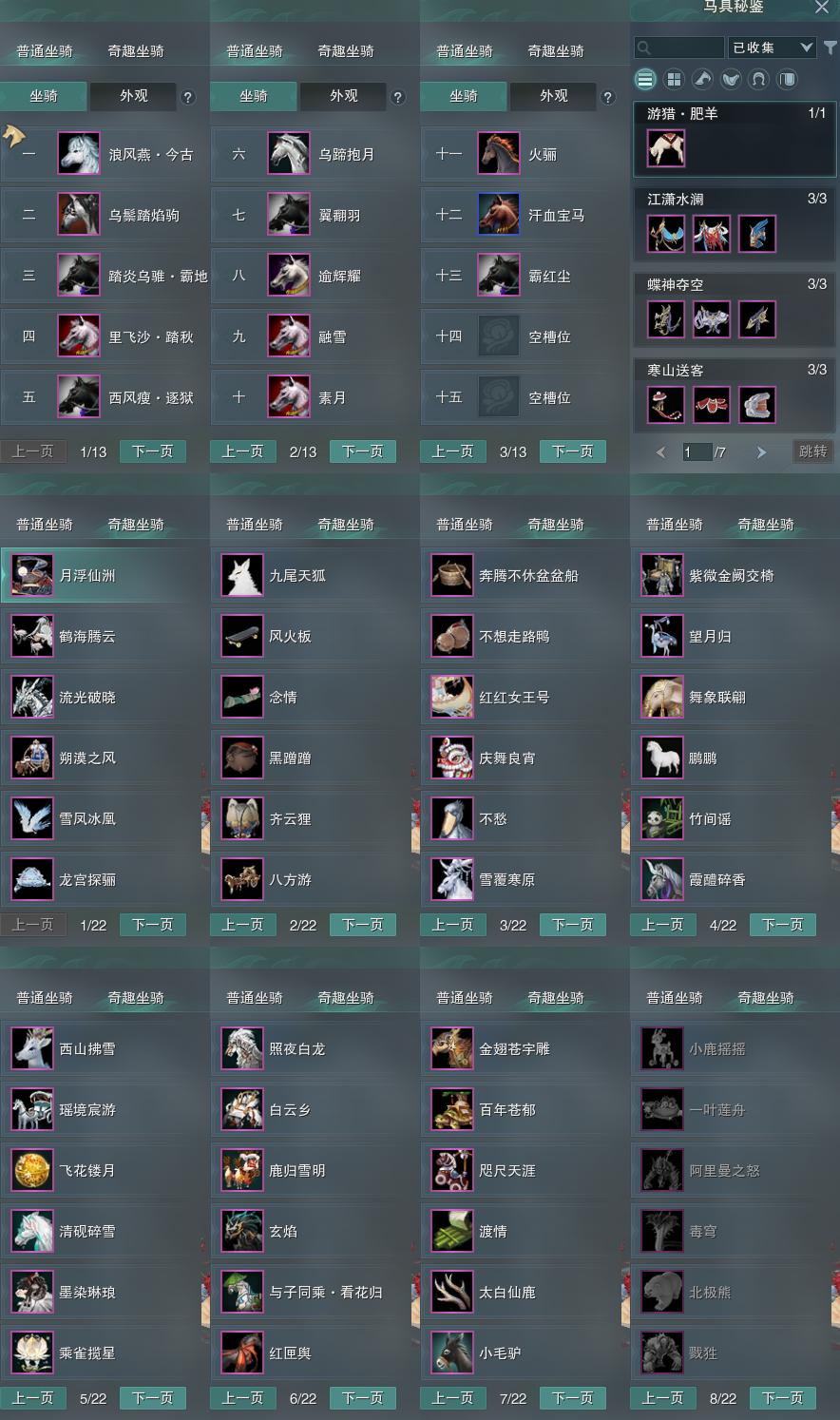 【坐骑】13个[踏炎霸地, 西风瘦逐狱, 乌蹄抱月, 里飞沙踏秋, 浪风燕今古, 霸红尘, 乌鬃踏焰驹]