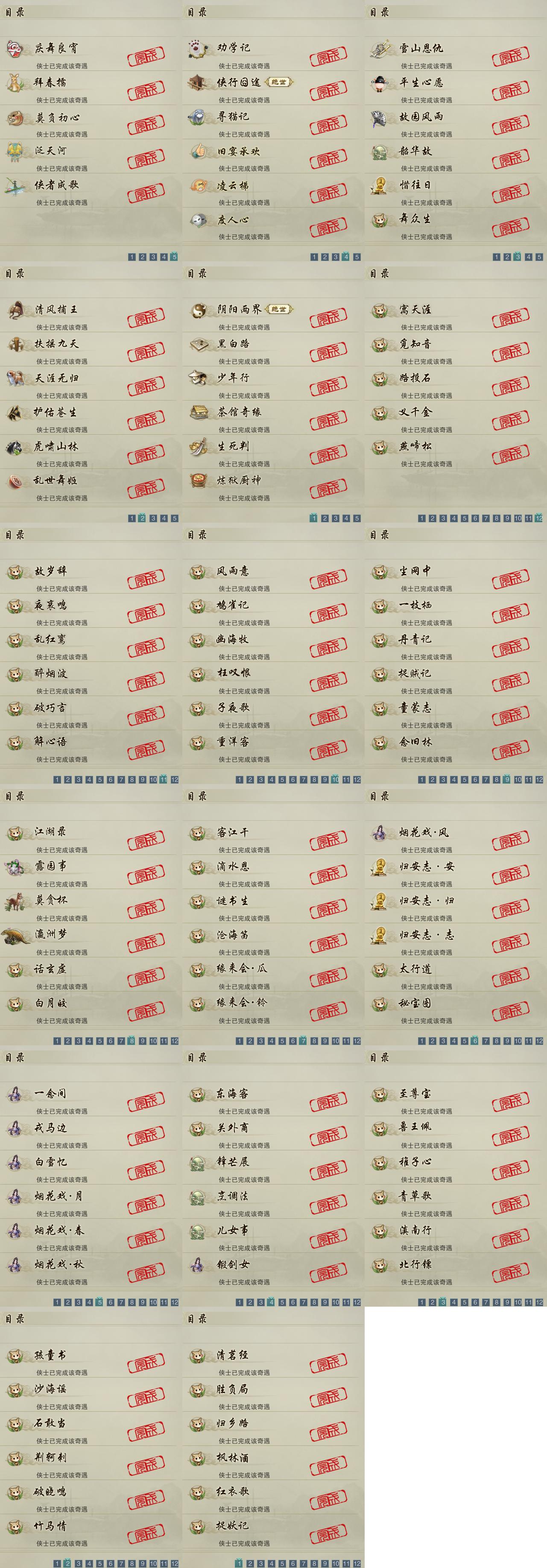 【奇遇】29个[天涯无归, 劝学记, 雪山恩仇, 阴阳两界, 莫负初心, 平生心愿, 黑白路, 惜往日, 乱世舞姬, 韶华故, 虎啸山林, 护佑苍生, 少年行, 故园风雨, 扶摇九天, 舞众生, 清风捕王, 侠行囧途, 寻猫记, 茶馆奇缘, 庆舞良宵, 生死判, 凌云梯, 炼狱厨神, 度人心, 旧宴承欢, 泛天河, 侠者成歌, 拜春擂]