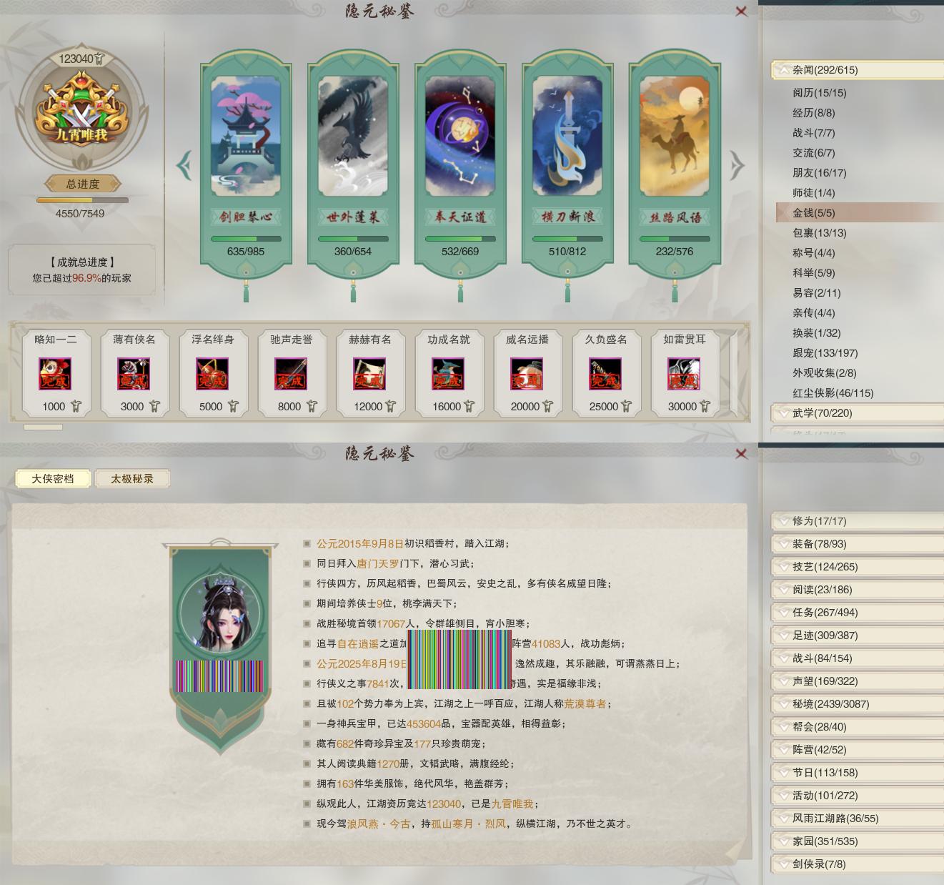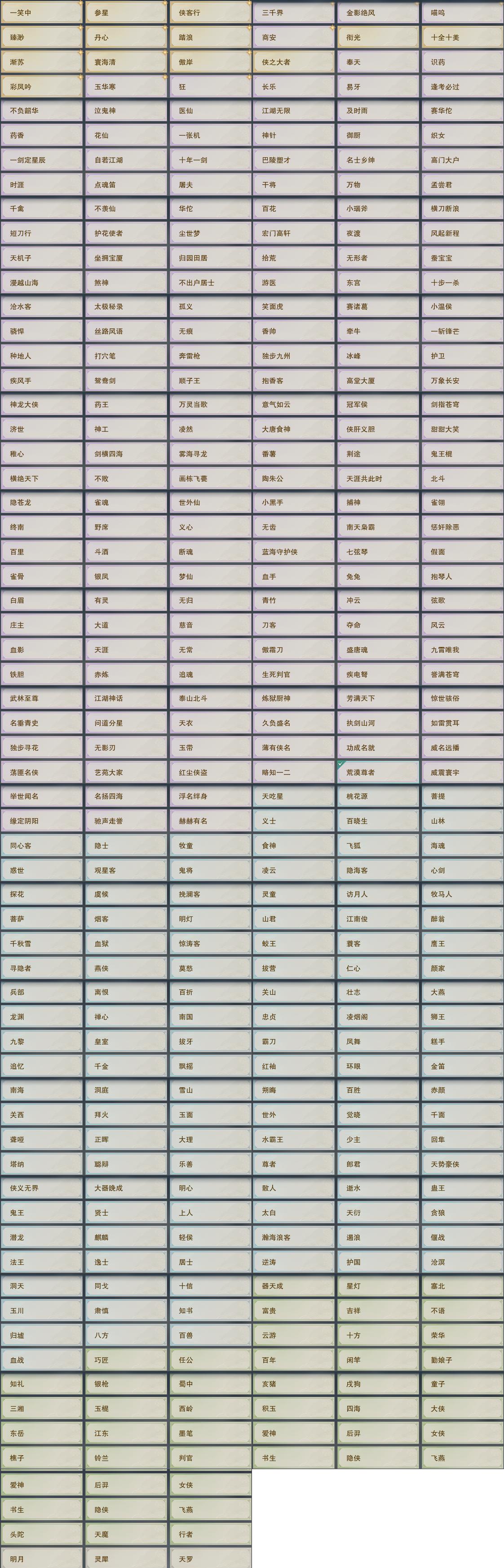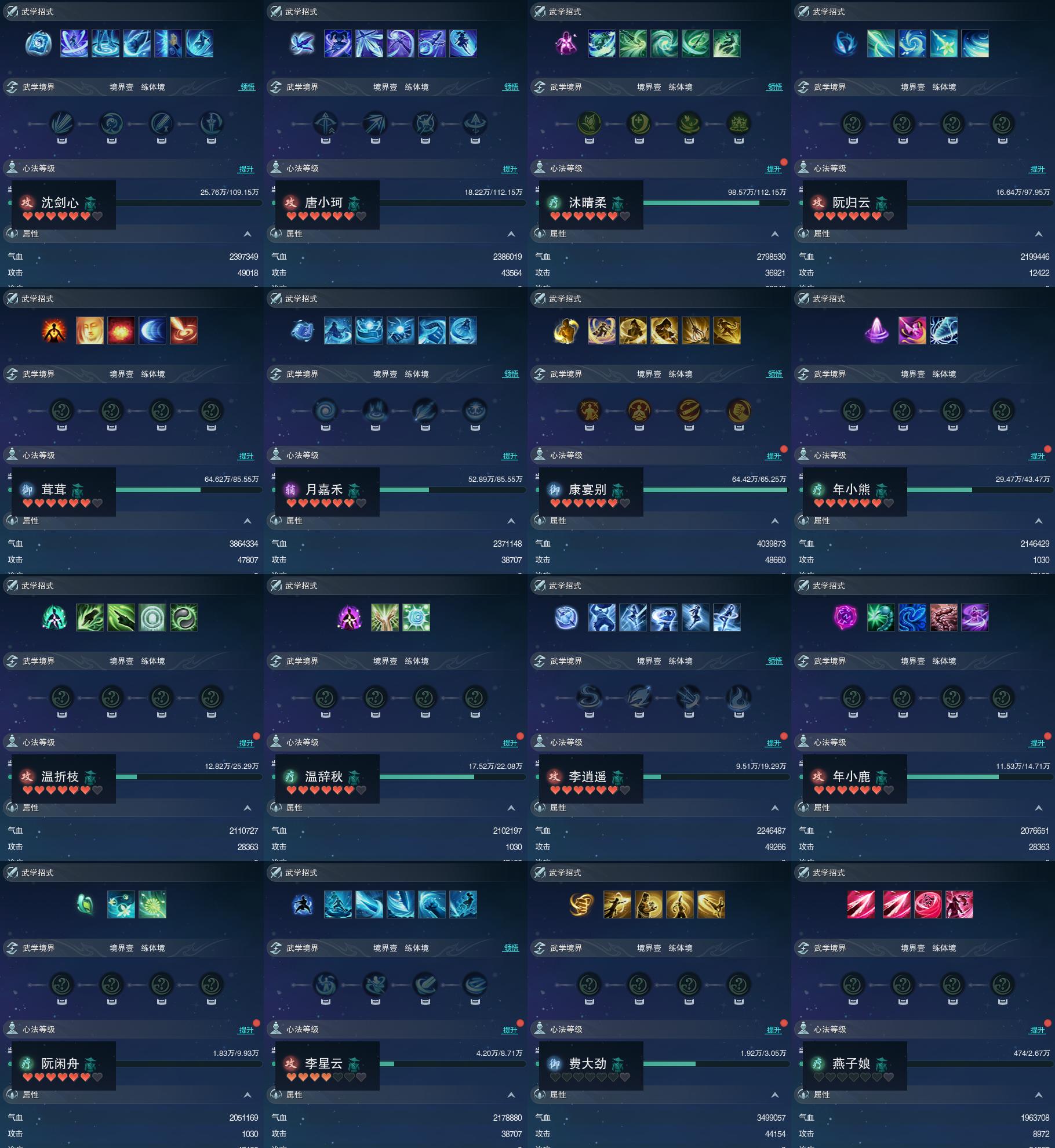 【同伴】沈剑心86级境界壹,唐小珂85级境界壹,沐晴柔85级境界壹,阮归云84级境界壹,茸茸志83级境界壹,月嘉禾83级境界壹,康宴别81级境界壹,年小熊78级境界壹,温折枝74级境界壹,温辞秋73级境界壹,李逍遥72级境界壹,年小鹿70级境界壹,阮闲舟67级境界壹,李星云66级境界壹,费大劲58级境界壹,燕子娘57级境界壹