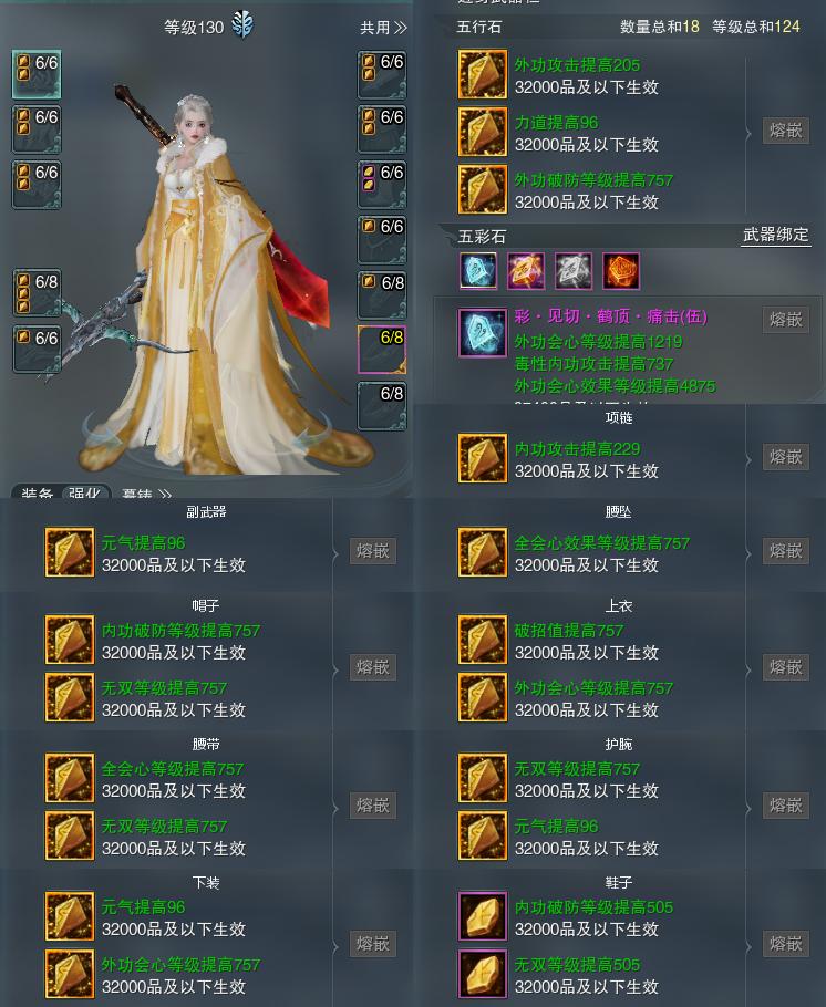 【橙武】(仅本门派)[120小铁*40, 130小铁*13, 110小铁*31, 100小铁*220, 95小铁*234, 90小铁*206, 80小铁*231, 70小铁*161, 100CW螭首千机, 90CW凤尾天机, 70CW鸢翔天, 门派特效抱朴狩天]