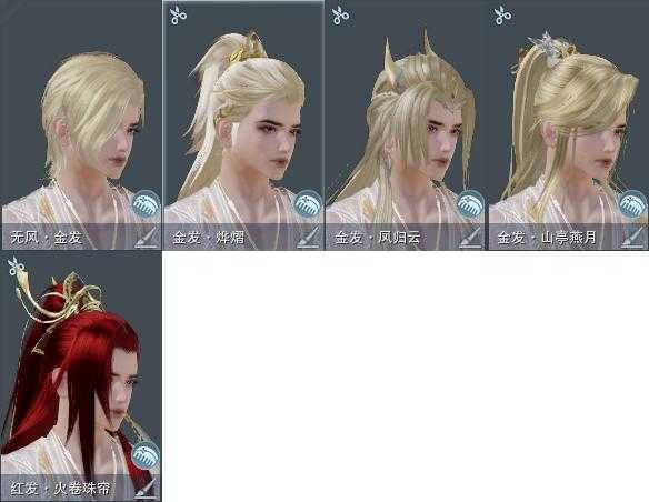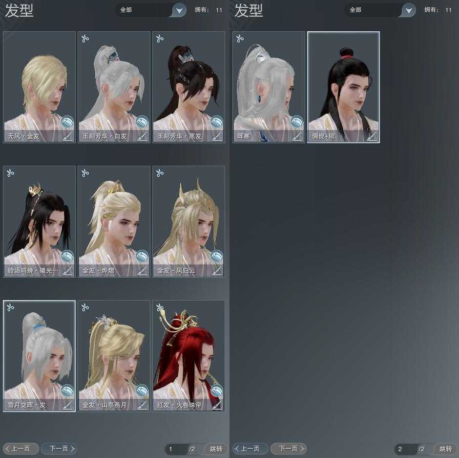 【发型】金发4个[国金, 狗金, 猪金, 无风金发], 红发1个[六红], 黑发2个, 白发4个, 盒子发型[雪月白发, 白楼兰黑发, 白楼兰白发], 总页数2