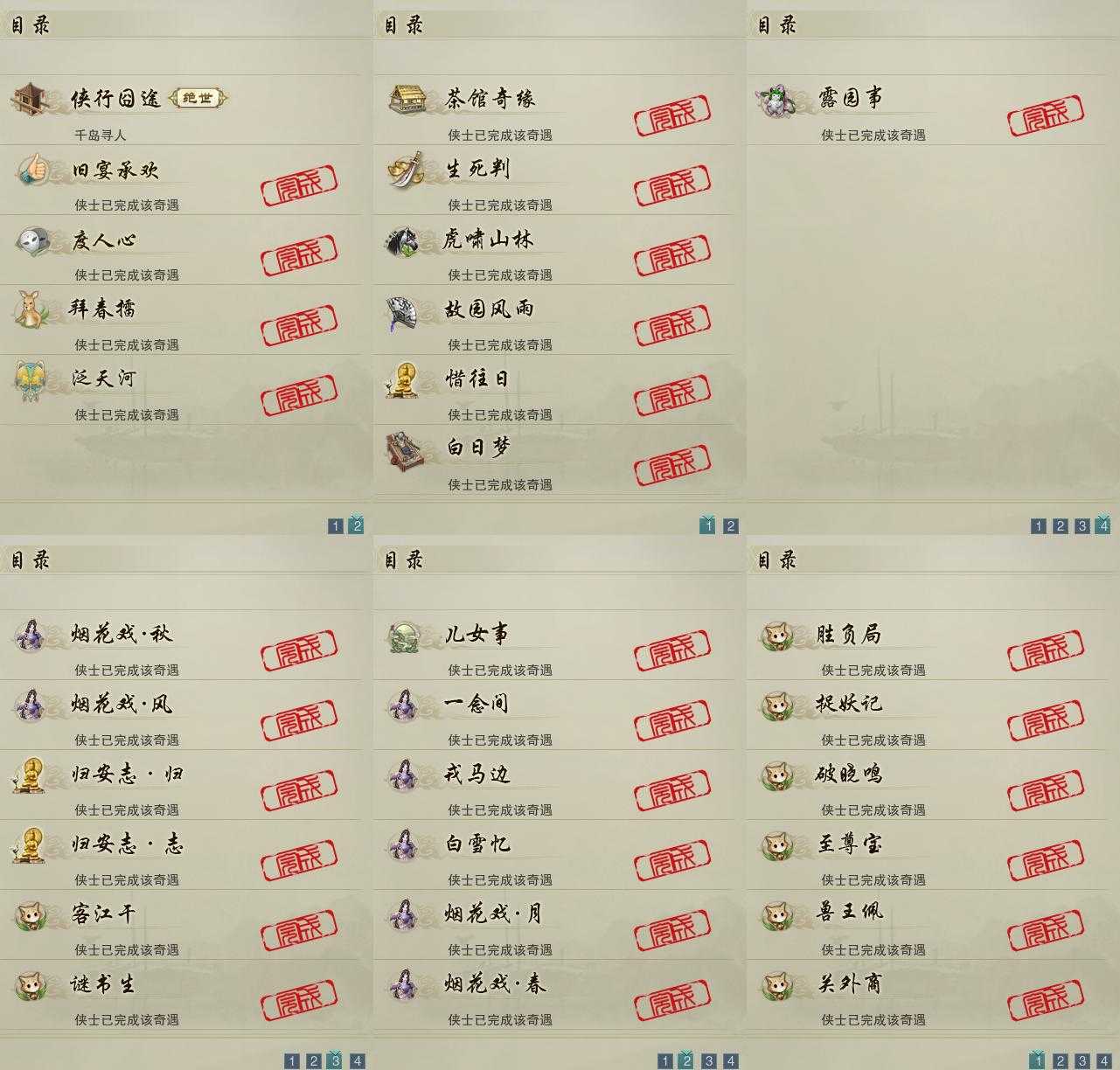 【奇遇】11个[白日梦, 惜往日, 虎啸山林, 故园风雨, 侠行囧途, 茶馆奇缘, 生死判, 度人心, 旧宴承欢, 泛天河, 拜春擂]