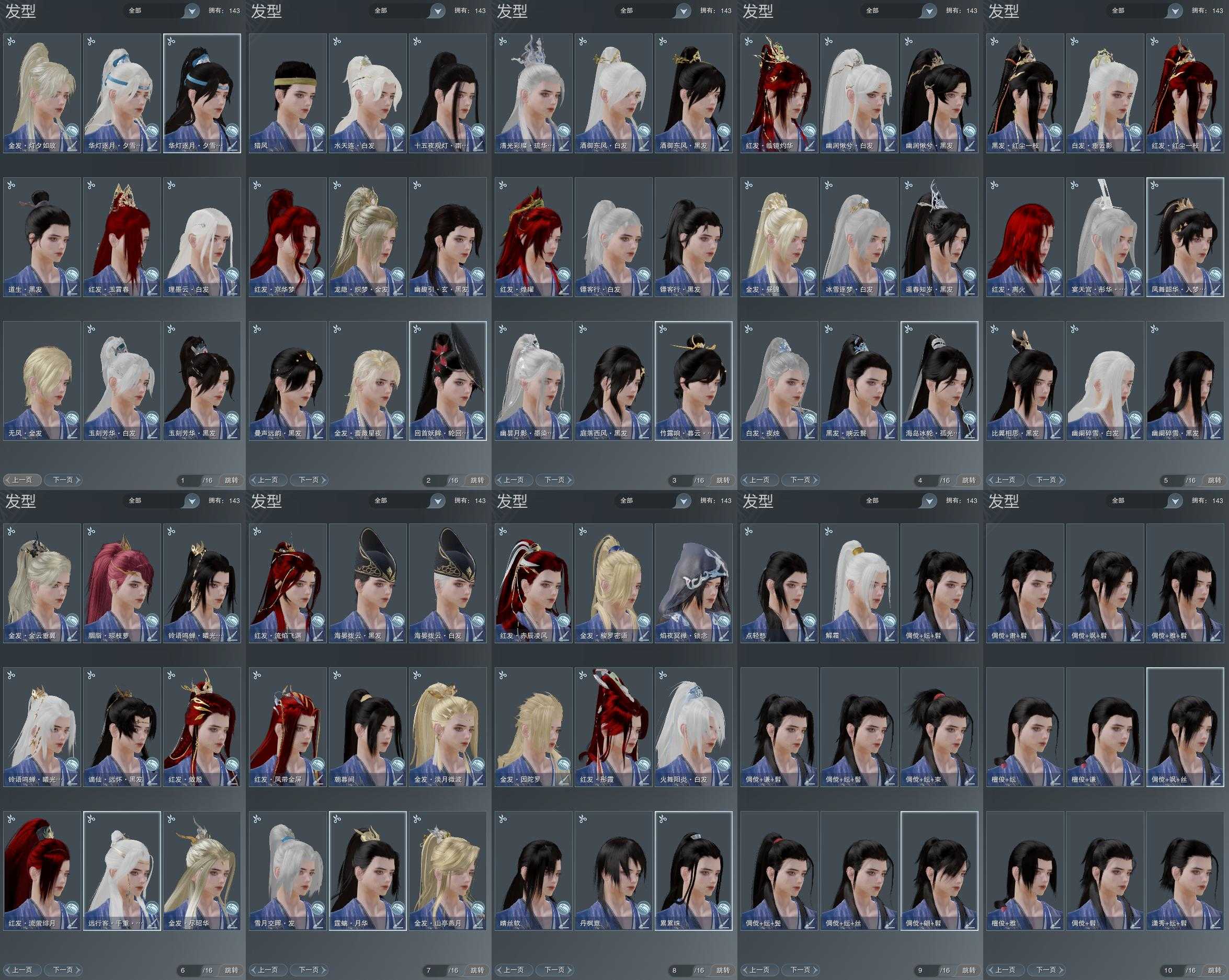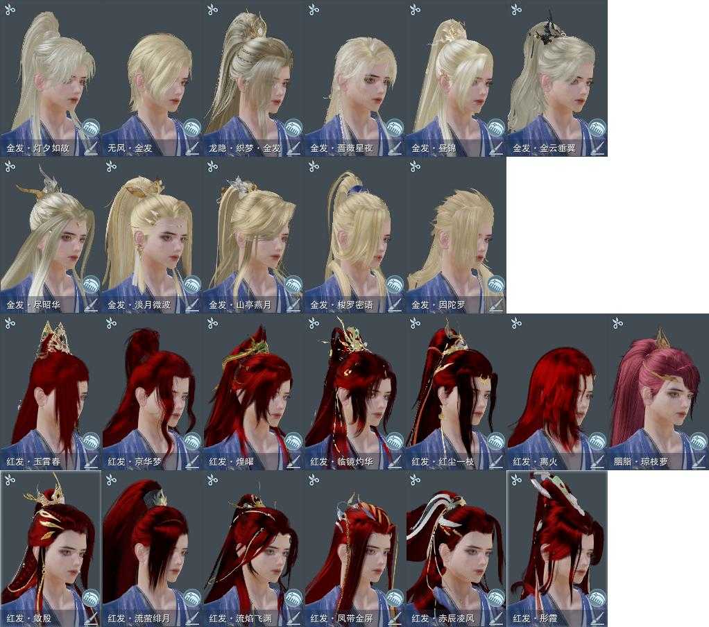 【发型】金发11个[猴金, 资历金, 中秋金, 国金, 倒闭金, 苍金, 虎金, 蔷薇金, 无风金发, 马金, 白龙隐金发], 红发13个[八红, 九红, 十二红, 十三红, 紫发, 羊红, 狗红, 猪红, 兔红, 小资历红, 龙红, 大资历红, 马红], 黑发30个, 白发20个, 盒子发型[狄仁杰黑, 黑谪仙黑发, 狄仁杰白, 雪月白发, 白楼兰黑发, 蓝腿白, 幽阑黑发, 五代七夕黑发, 白楼兰白发, 幽阑白发, 入梦黑发, 白狮白发, 十二黑, 白海岛黑发, 红梅盒黑发, 花滑白发, 竹露响暮云黑发, 幽涧愀兮白发, 镖盒黑发, 黑幽昙白发, 卿酒盒黑发, 镖盒白发, 红黑妖眸盒黑发, 卿酒盒白发, 蓝钻石盒白发, 黑幽馥黑发, 蓝观灯盒黑发, 华灯夕雪黑发, 华灯夕雪白发], 总页数10