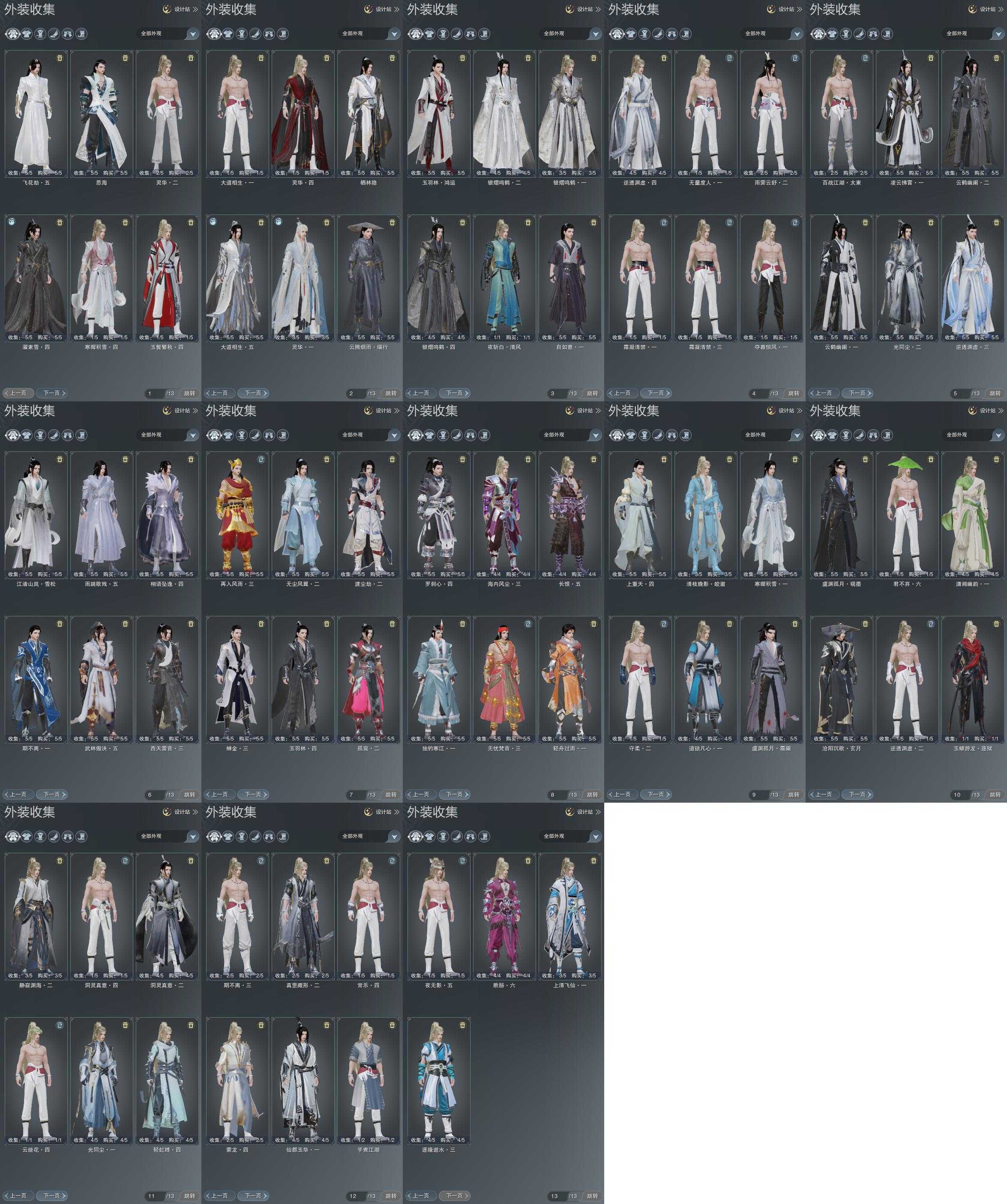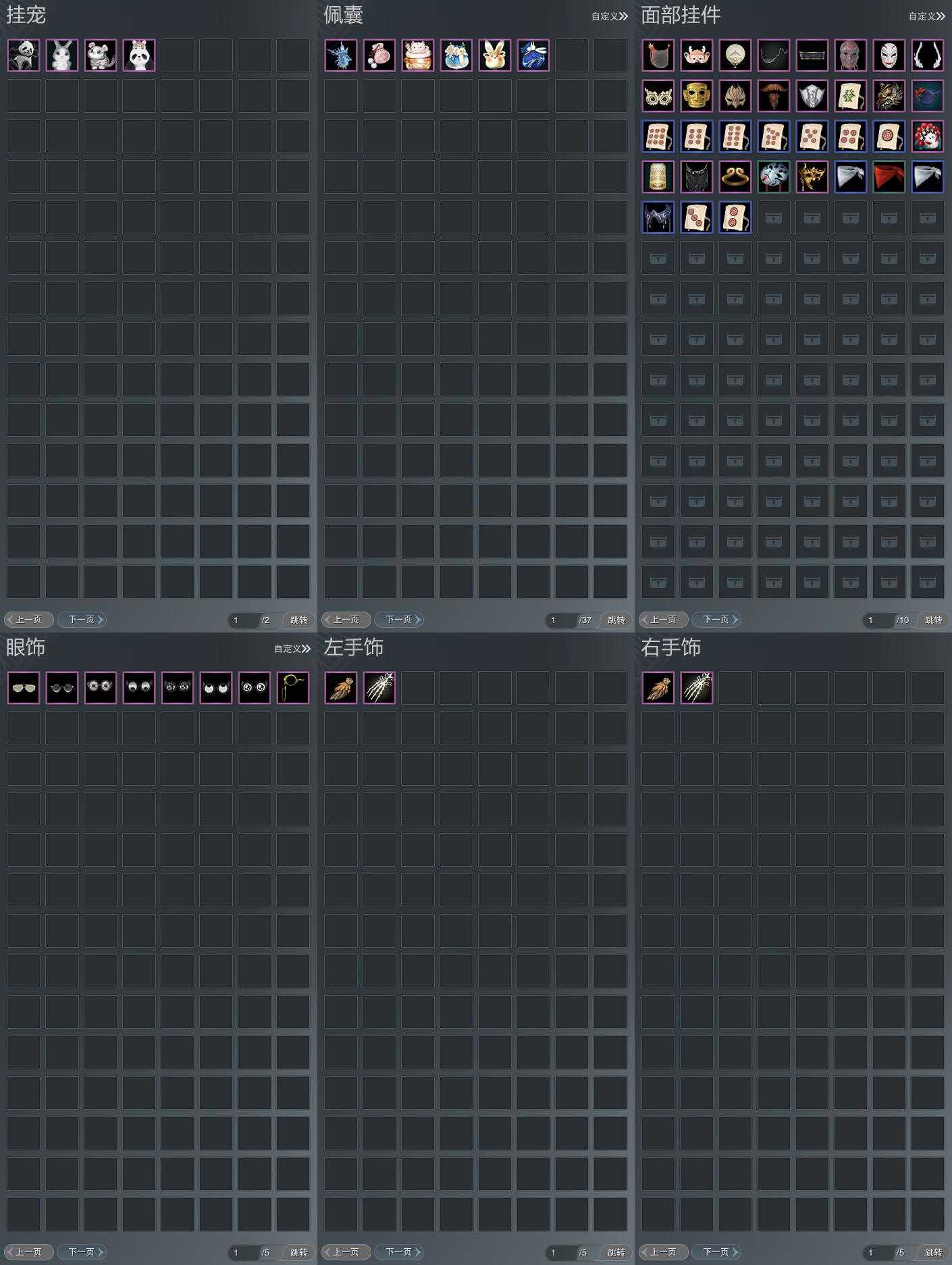 盒子:[秃盒, 狄盒, 猪盒, 棋盒(缺背挂), 花盒, 二代万花盒, 五七盒(缺白发), 蓝腿盒, 灯盒, 青盒, 刀宗盒, 白楼兰盒, 华灯夕雪(豪), 镖盒, 兔盒, 咩盒, 卿酒盒, 红黑妖龙盒(标), 原色猪猪响(标), 蓝观灯盒(标), 白赵云盒]