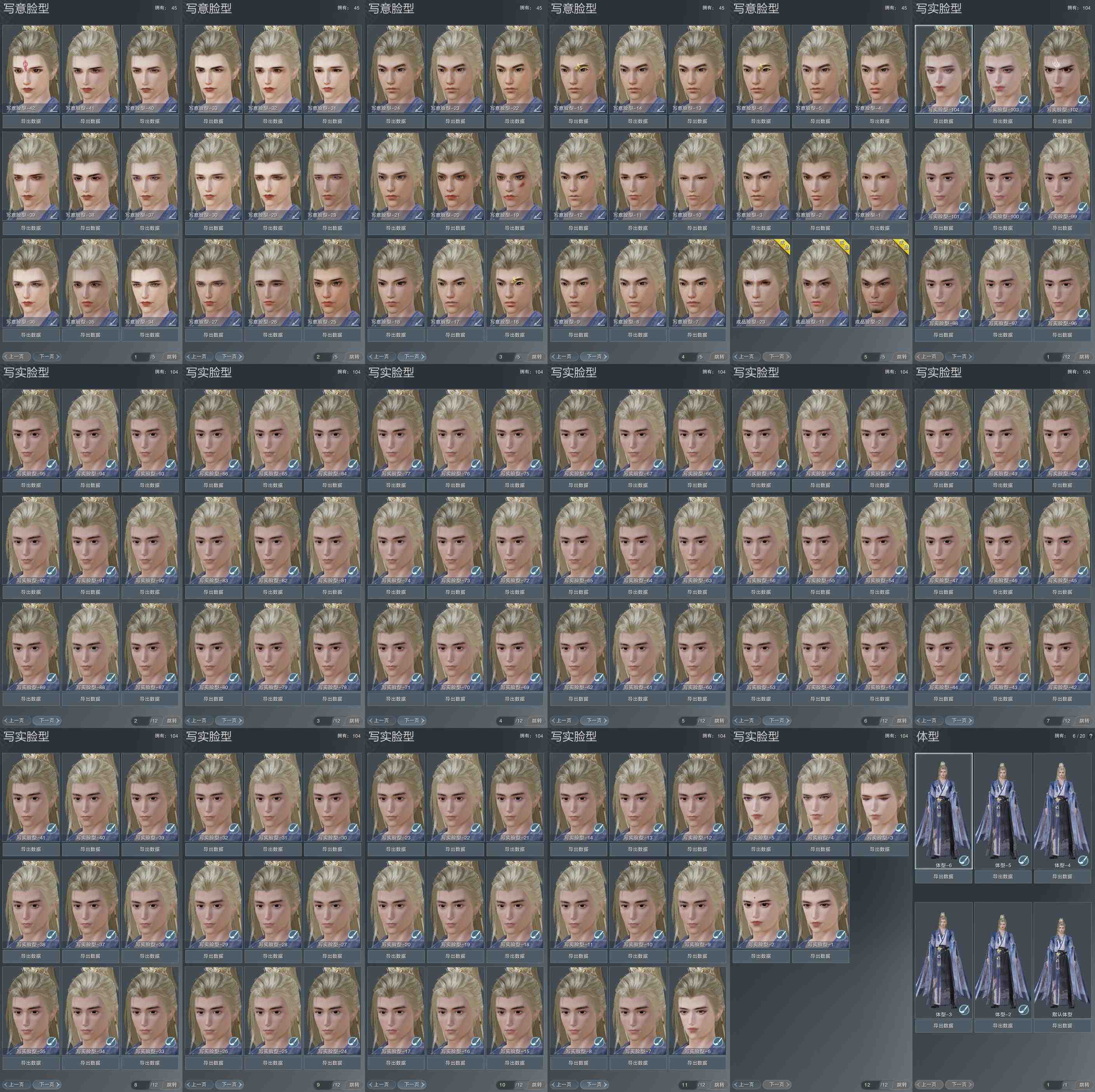 【捏脸】写意脸型45个,写实脸型104个,体型6个