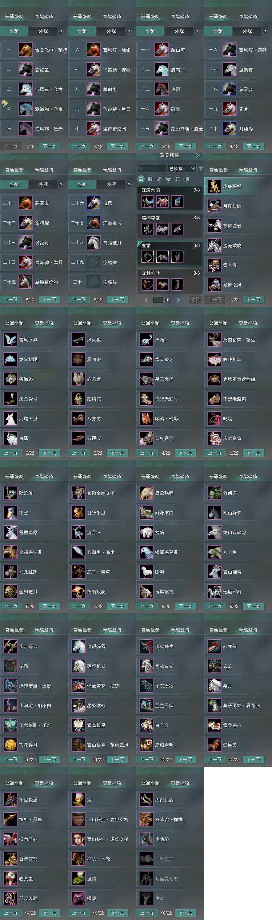 【坐骑】28个[踏炎腾云, 西风瘦烛银, 西风瘦逐狱, 青海骢黯月, 飞霞骠惊帆, 飞霞骠黑云, 乌蹄抱月, 浪风燕今古, 瀛海驹游夜, 霸红尘, 雷首飞电驰辉, 乌鬃踏焰驹]