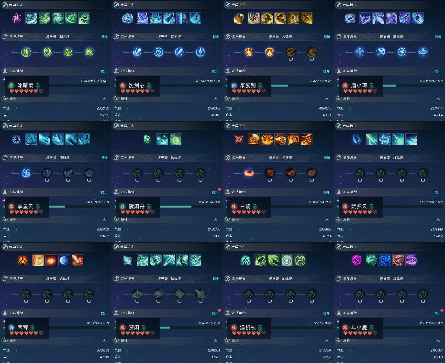 【同伴】沐晴柔90级境界伍,沈剑心88级境界伍,康宴别84级境界叁,唐小珂84级境界伍,李星云84级境界贰,阮闲舟82级境界壹,白鹊志82级境界贰,阮归云81级境界壹,茸茸志81级境界壹,贺闲志81级境界壹,温折枝80级境界壹,年小鹿80级境界壹