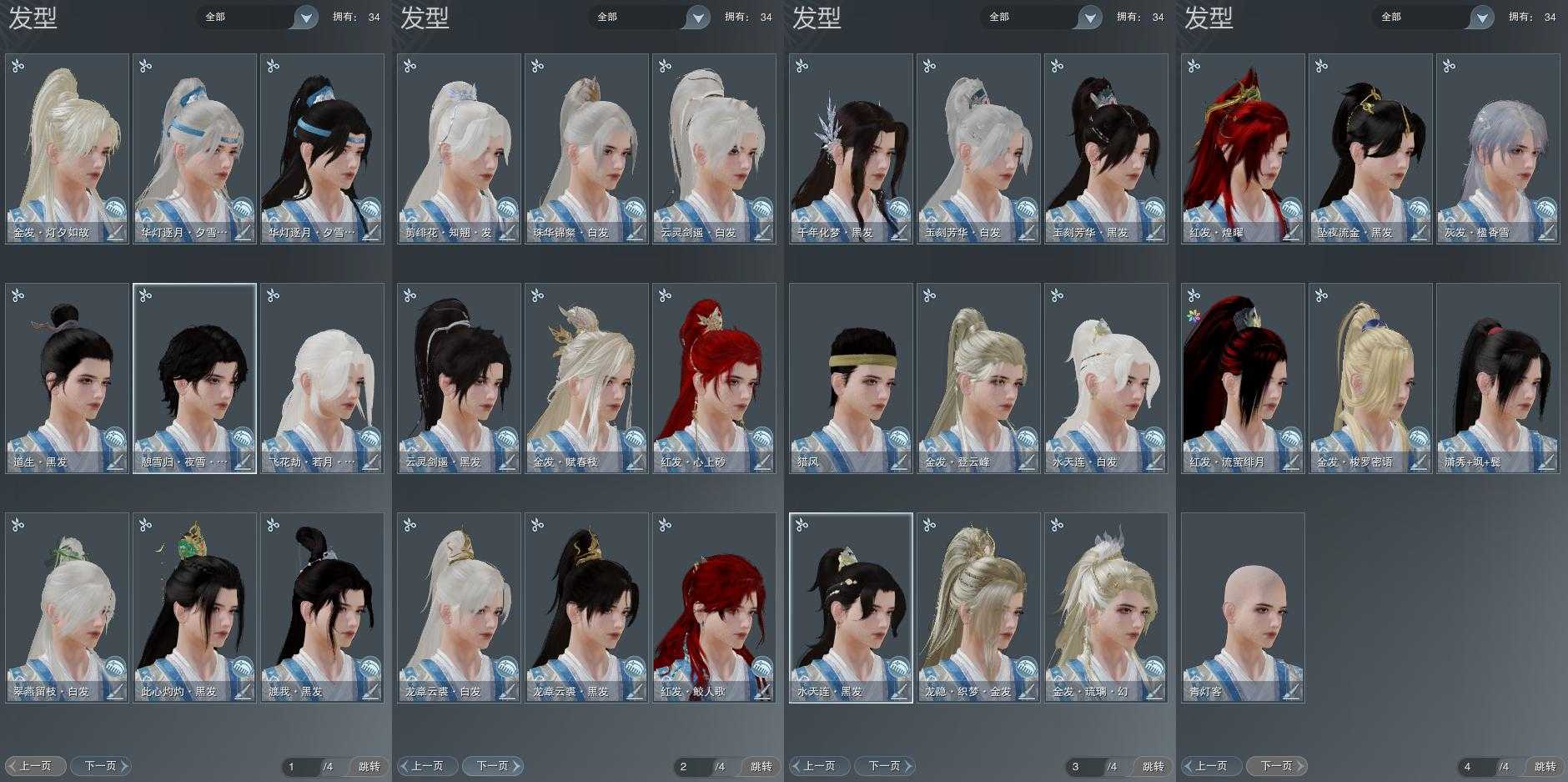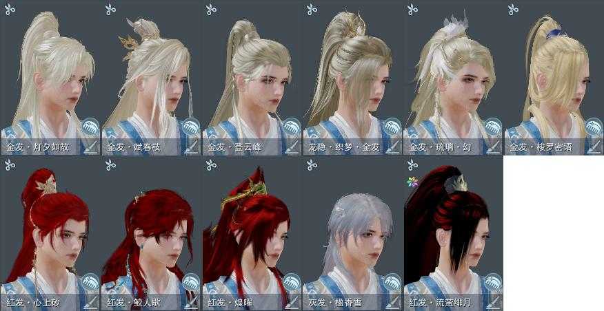 【发型】金发6个[资历金, 海金, 三代金, 蛇金, 马金, 白龙隐金发], 红发5个[兔红, 小资历红, 十五红, 蛇红, 一代灰], 黑发12个, 白发9个, 盒子发型[金鳞盒黑发, 梦盒黑发, 墨龙盒黑发, 墨龙盒白发, 仙剑黑发, 仙剑白发, 渡我黑发, 十七黑发, 粉毛衣黑发, 华灯夕雪黑发, 华灯夕雪白发], 总页数4