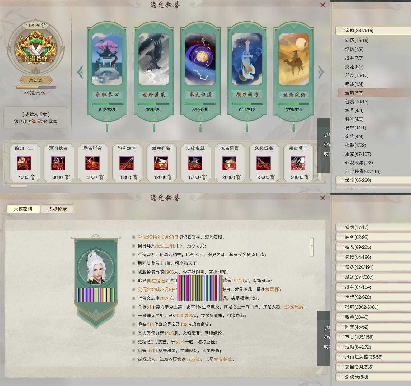 【奇遇】22个[白日梦, 三山四海, 劝学记, 兔江湖, 黑白路, 平生心愿, 惜往日, 扶摇九天, 流年如虹, 清风捕王, 寻猫记, 侠行囧途, 茶馆奇缘, 庆舞良宵, 凌云梯, 度人心, 旧宴承欢, 泛天河, 侠者成歌, 拜春擂, 福运满载, 归苍莽]