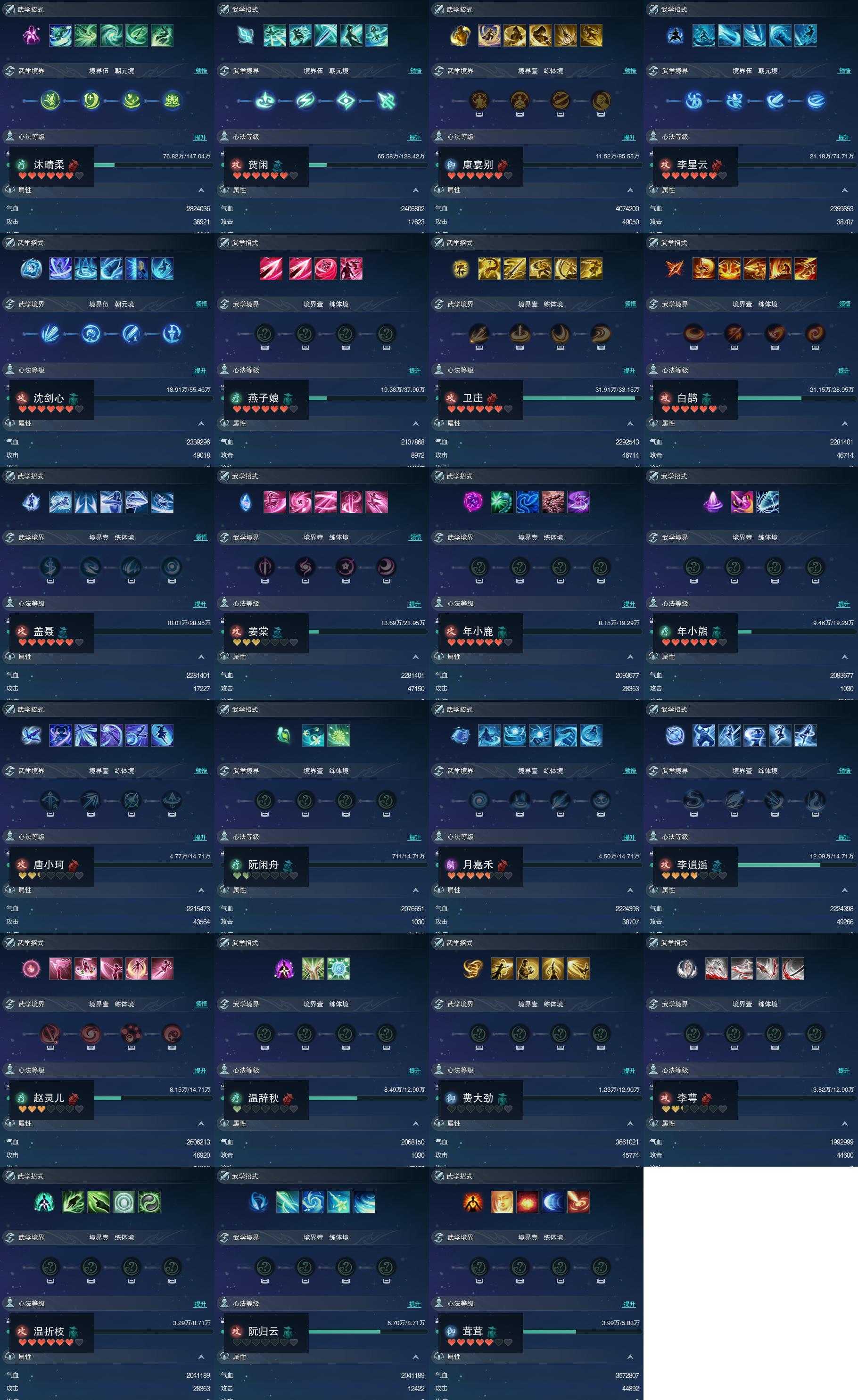 【同伴】沐晴柔87级境界伍,贺闲意86级境界伍,康宴别83级境界壹,李星云82级境界伍,沈剑心81级境界伍,燕子娘77级境界壹,卫庄76级境界壹,白鹊志75级境界壹,盖聂75级境界壹,姜棠意75级境界壹,年小鹿72级境界壹,年小熊72级境界壹,唐小珂70级境界壹,阮闲舟70级境界壹,月嘉禾70级境界壹,李逍遥70级境界壹,赵灵儿70级境界壹,温辞秋69级境界壹,费大劲69级境界壹,李萼69级境界壹,温折枝66级境界壹,阮归云66级境界壹,茸茸志63级境界壹