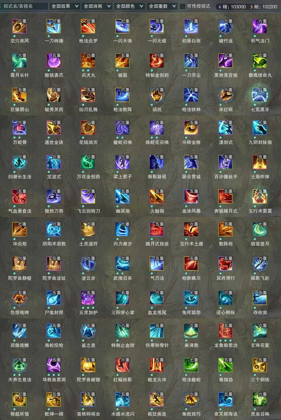 【橙武】(仅本门派)[130CW伏魔悲音, 130CW寂夜听雷, 120小铁*212, 130小铁*10, 110玄晶*1, 110小铁*384, 100小铁*365, 95小铁*224, 90小铁*233, 80小铁*364, 70小铁*160, 120CW寄骨, 120CW螭尘, 90CW泰阿, 90CW千叶长生, 门派特效岚尘金蛇]